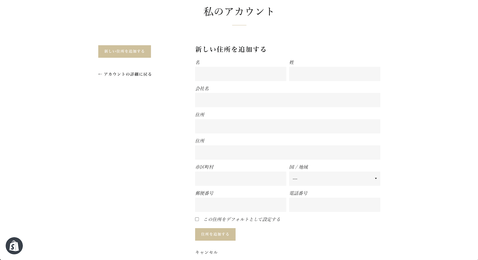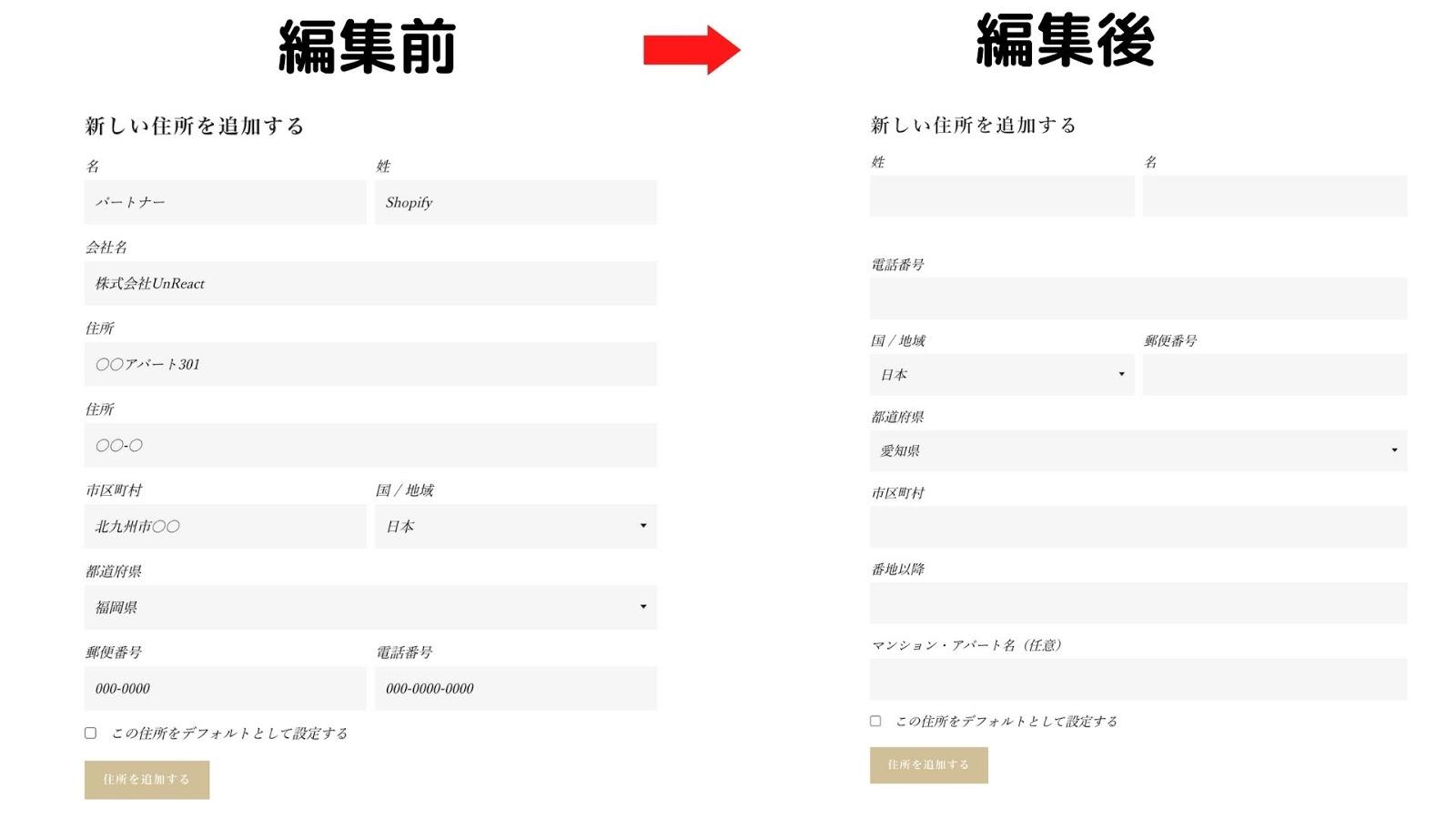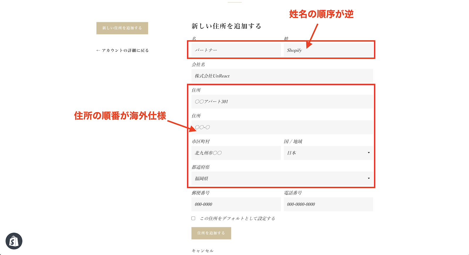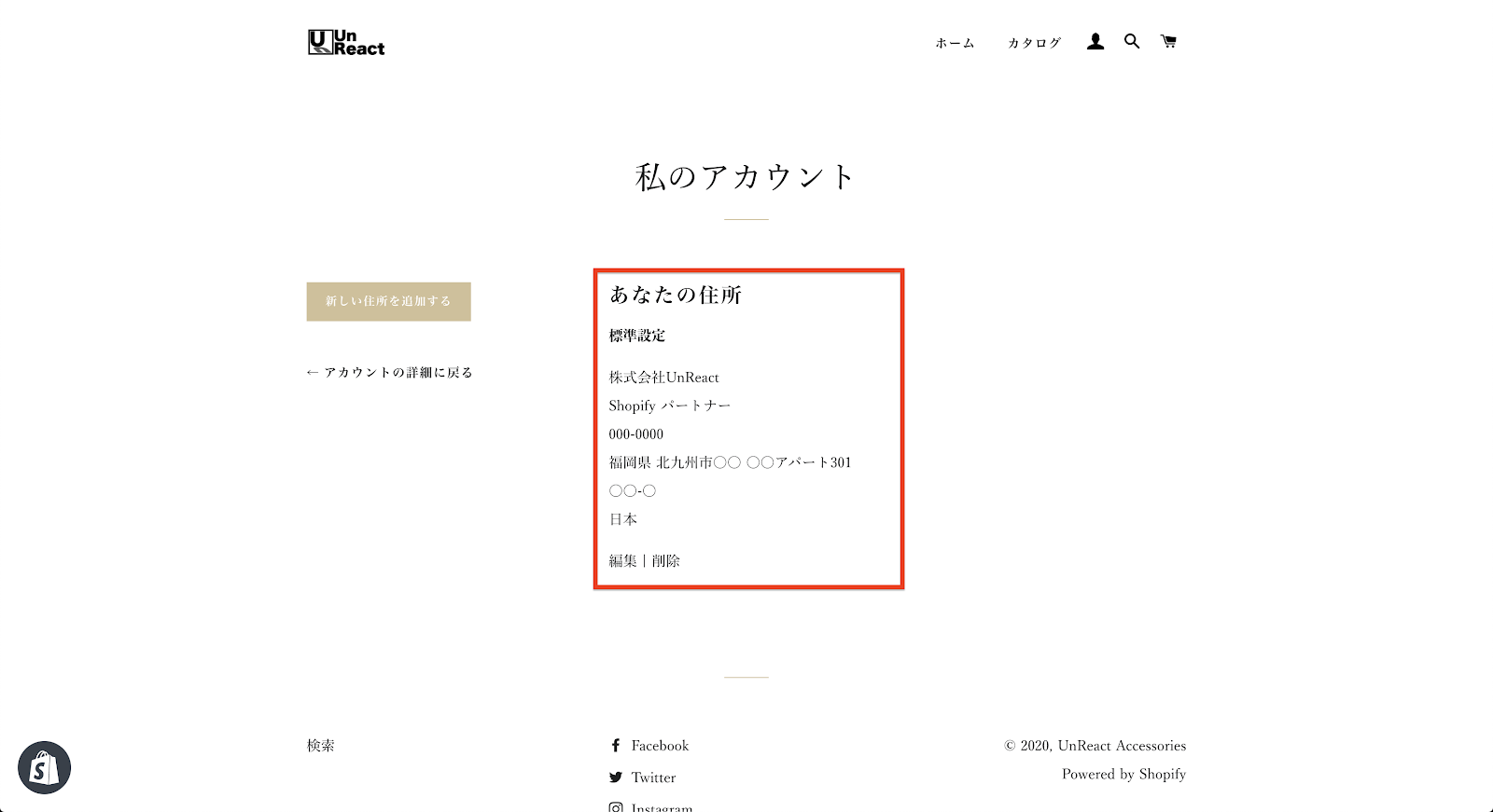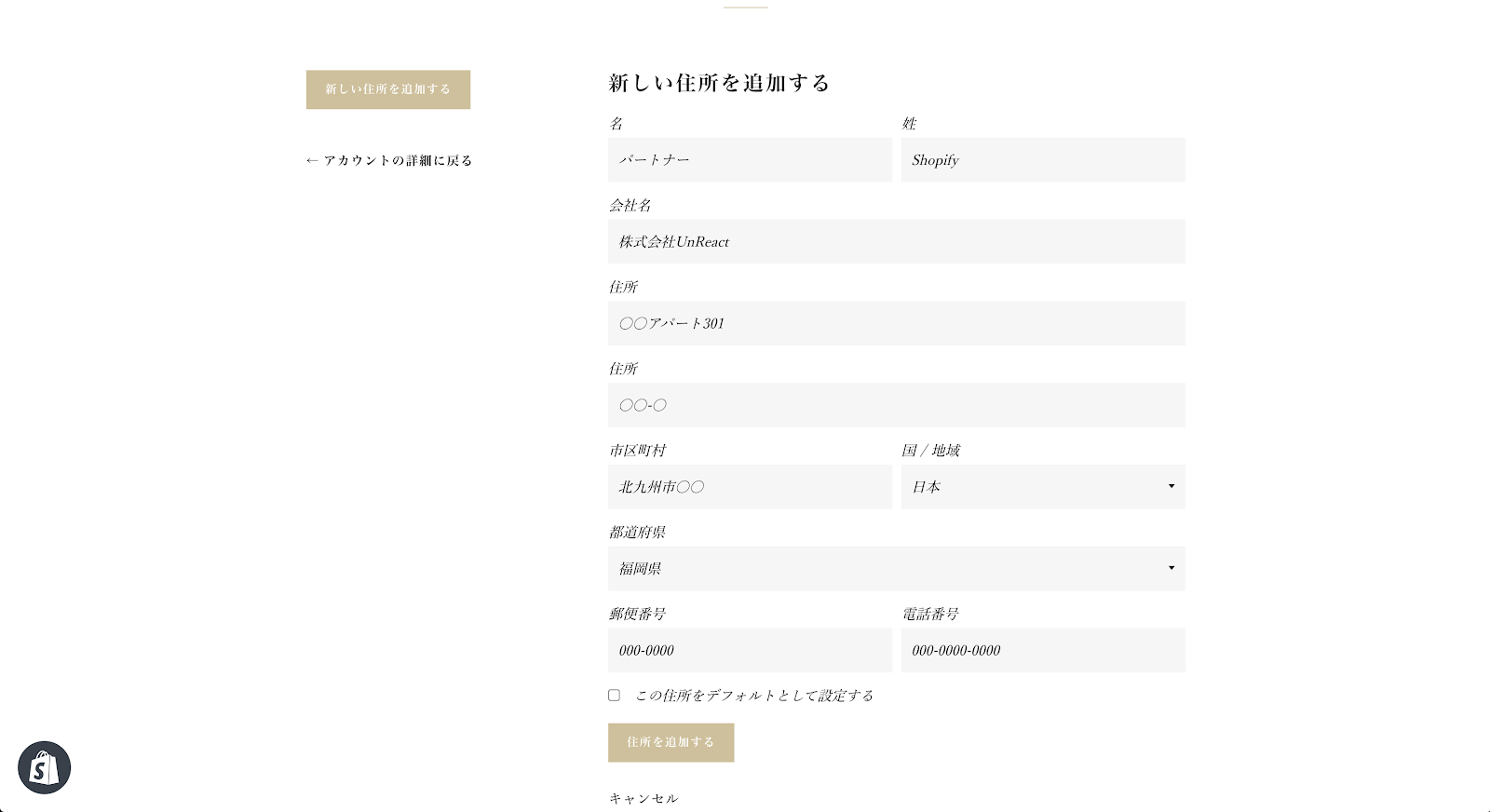 今回は、Shopify のデフォルト機能でアカウント登録機能を実装しました。Shopify は海外のサービスなので、住所の入力欄を編集しないといけないのが少し面倒です。