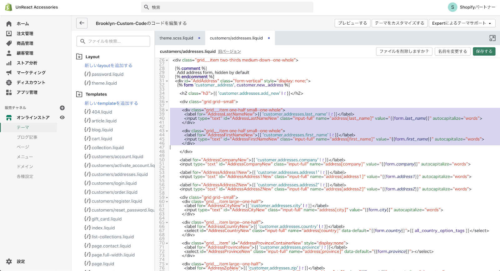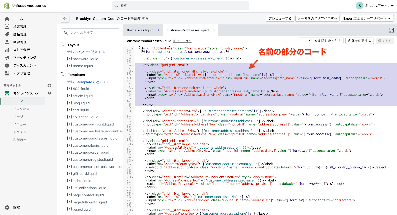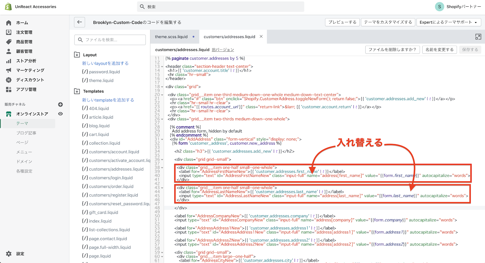 まず、姓名の順番を入れ替えます。customers/addresses.liquid に記述しているコードの中から、名前の入力欄を記述しているコードを探します。