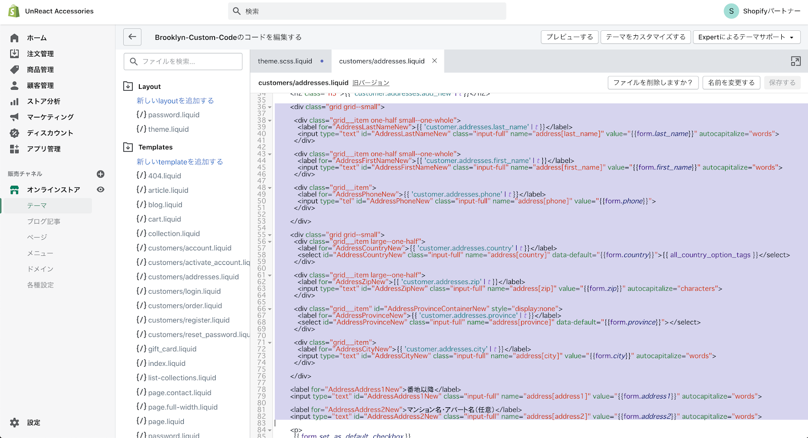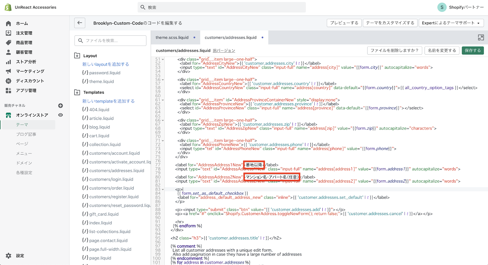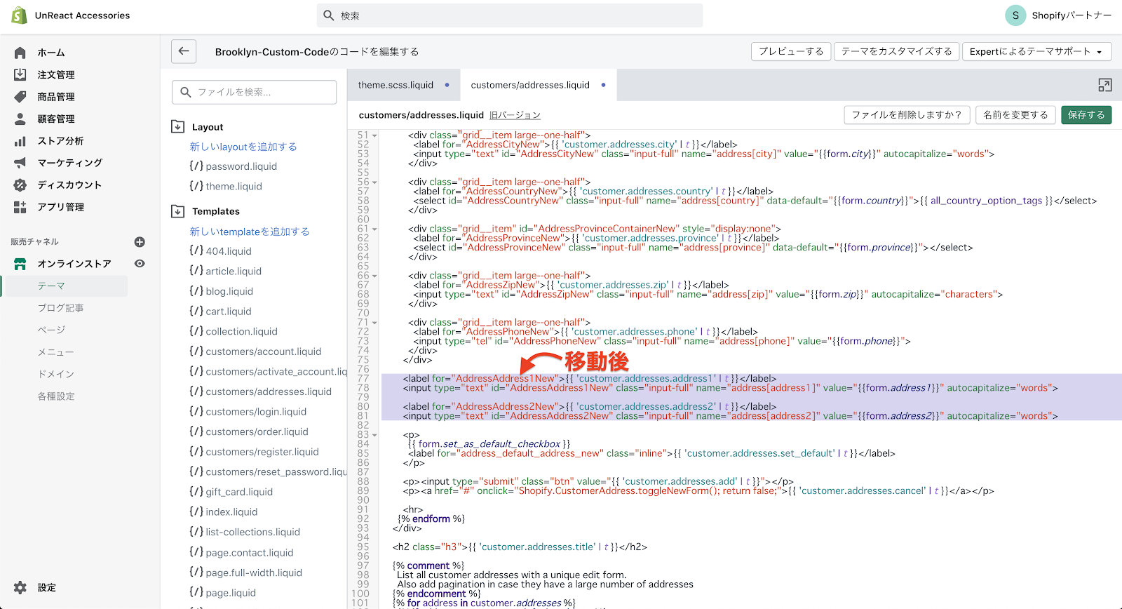 まず、姓名の順番を入れ替えます。customers/addresses.liquid に記述しているコードの中から、名前の入力欄を記述しているコードを探します。