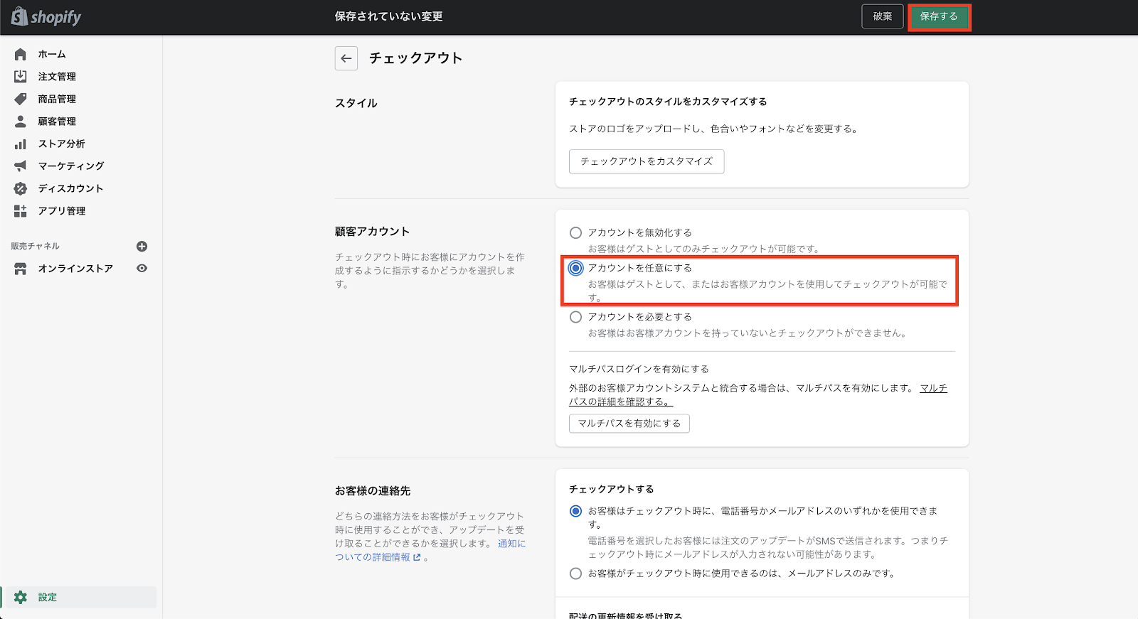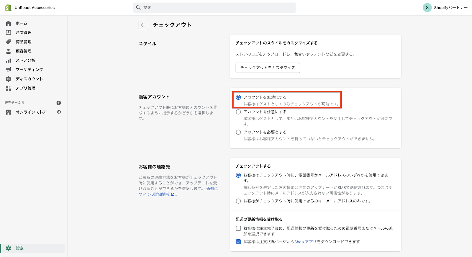 チェックアウトの設定に進むと、「顧客アカウント」という設定項目があります。デフォルトでは、この設定が「アカウントを無効化する」となっています。