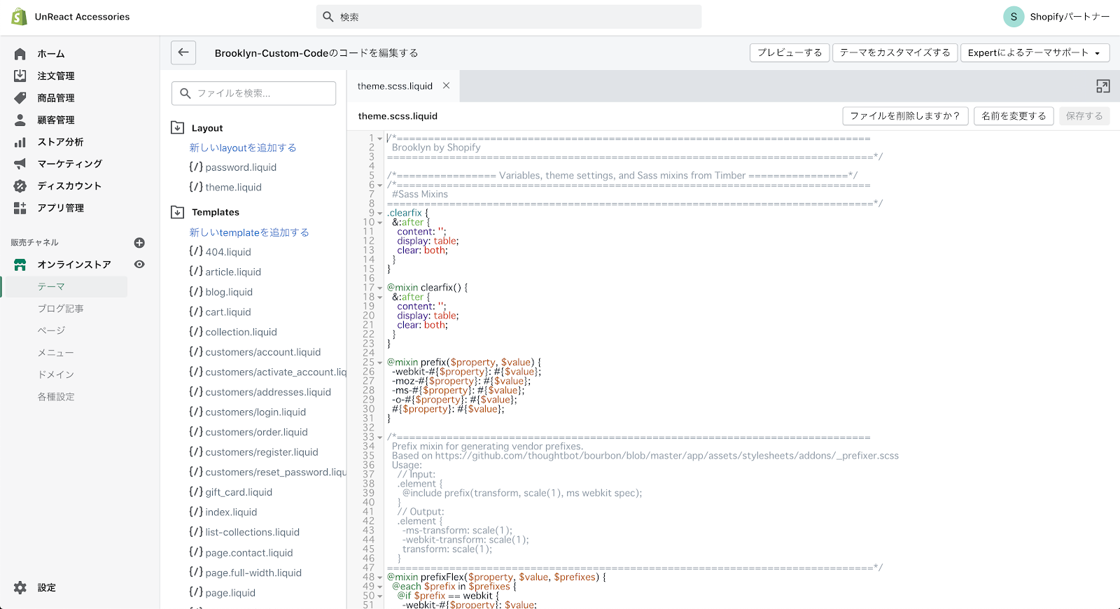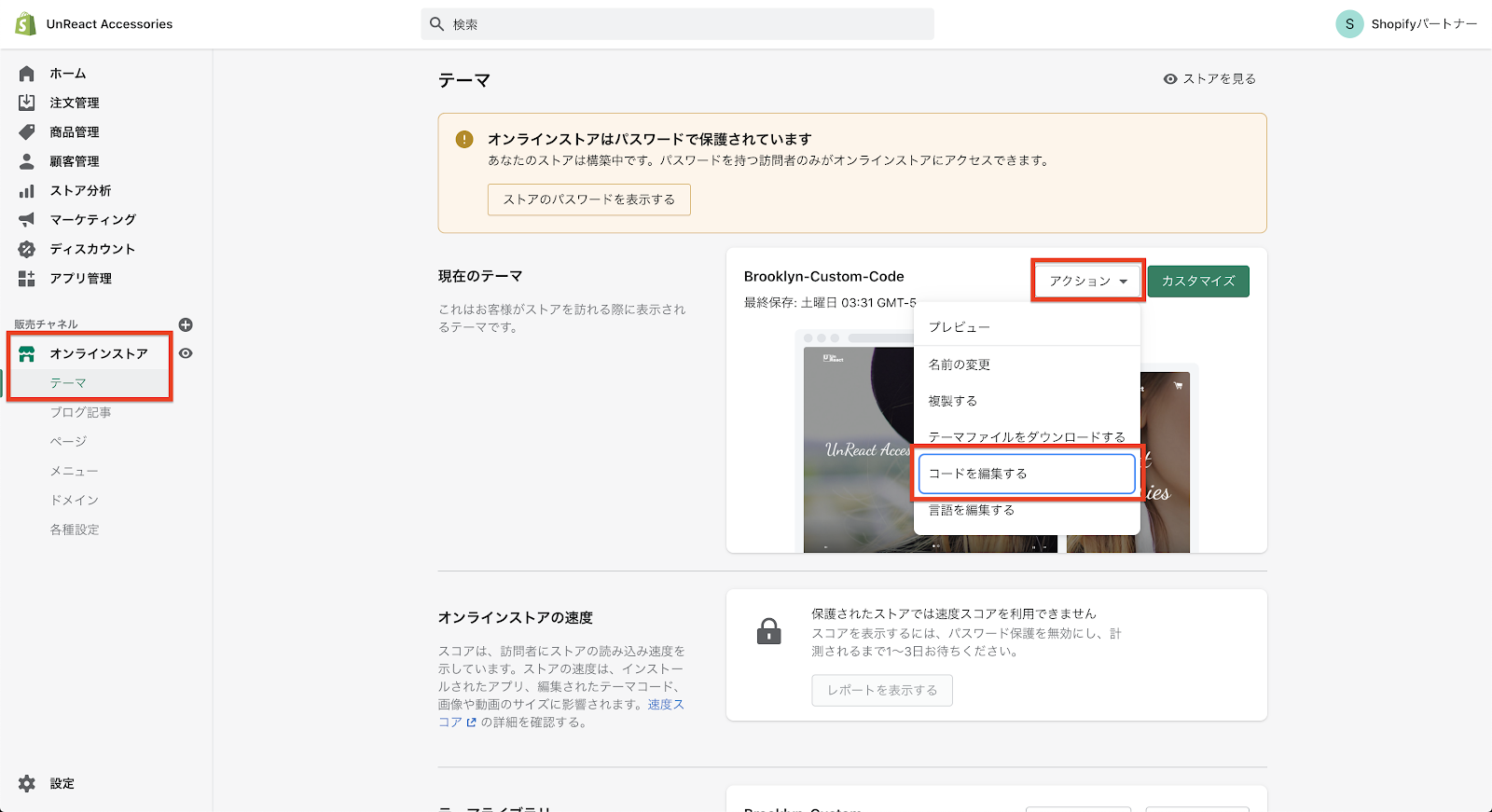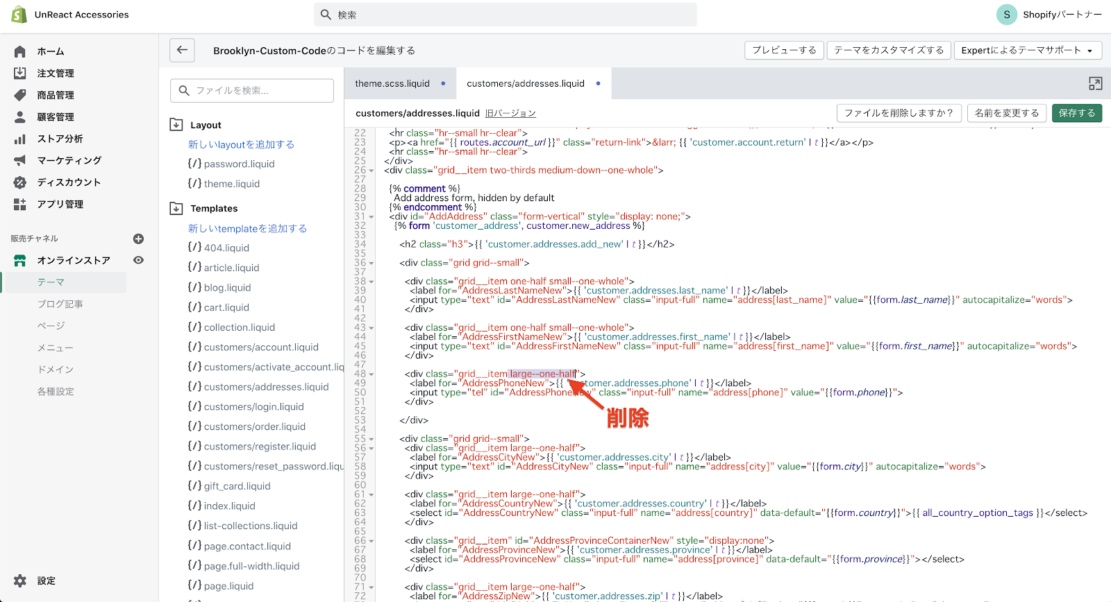 住所登録ページの編集をしていきます。コードの編集をするので、「オンラインストア > 現在のテーマ > アクション > コードを編集する」へ進みます。プレビュー画面が閉じていたらプレビュー画面も開いておきましょう。
