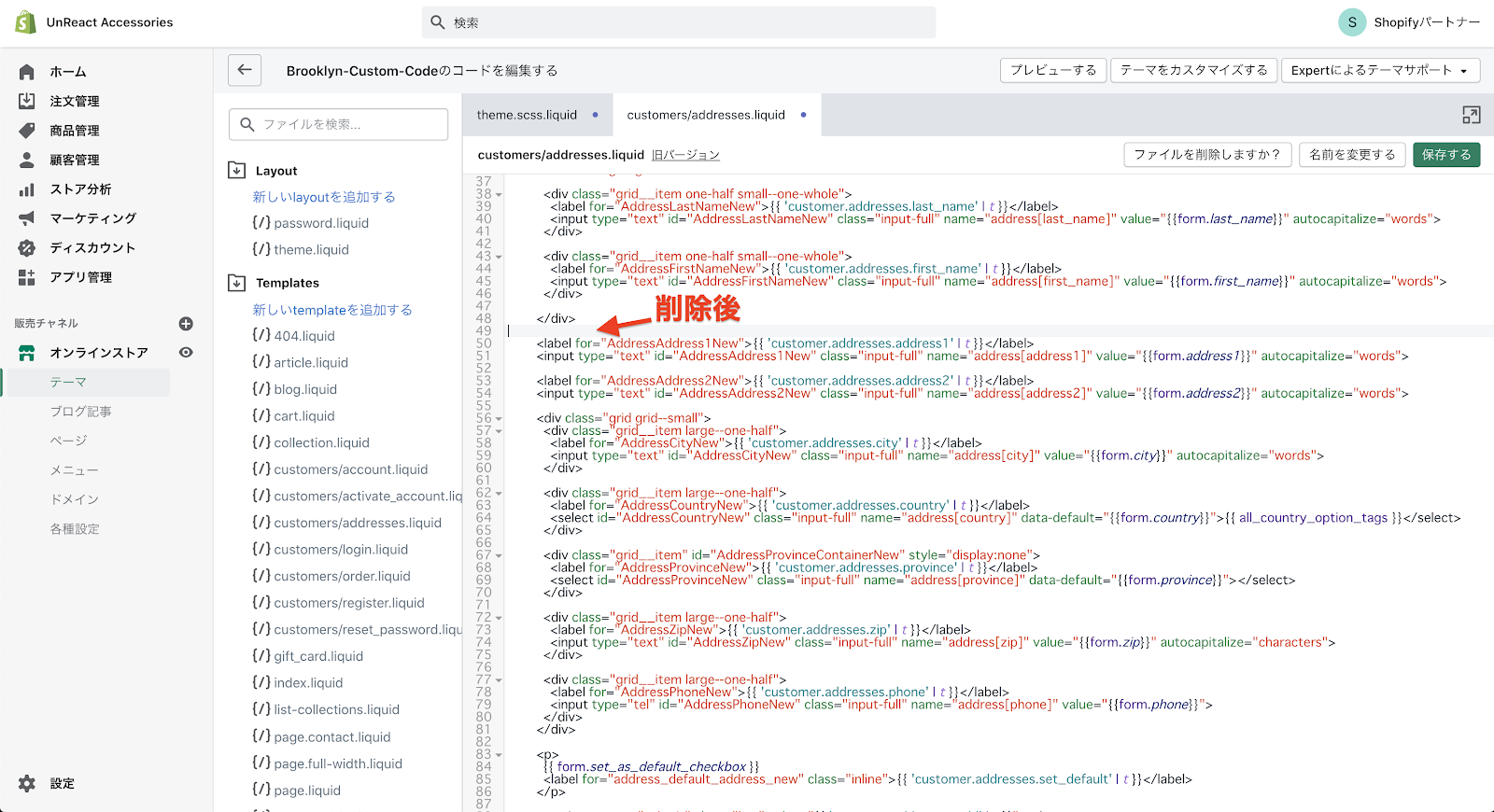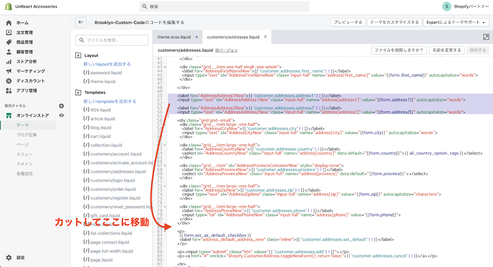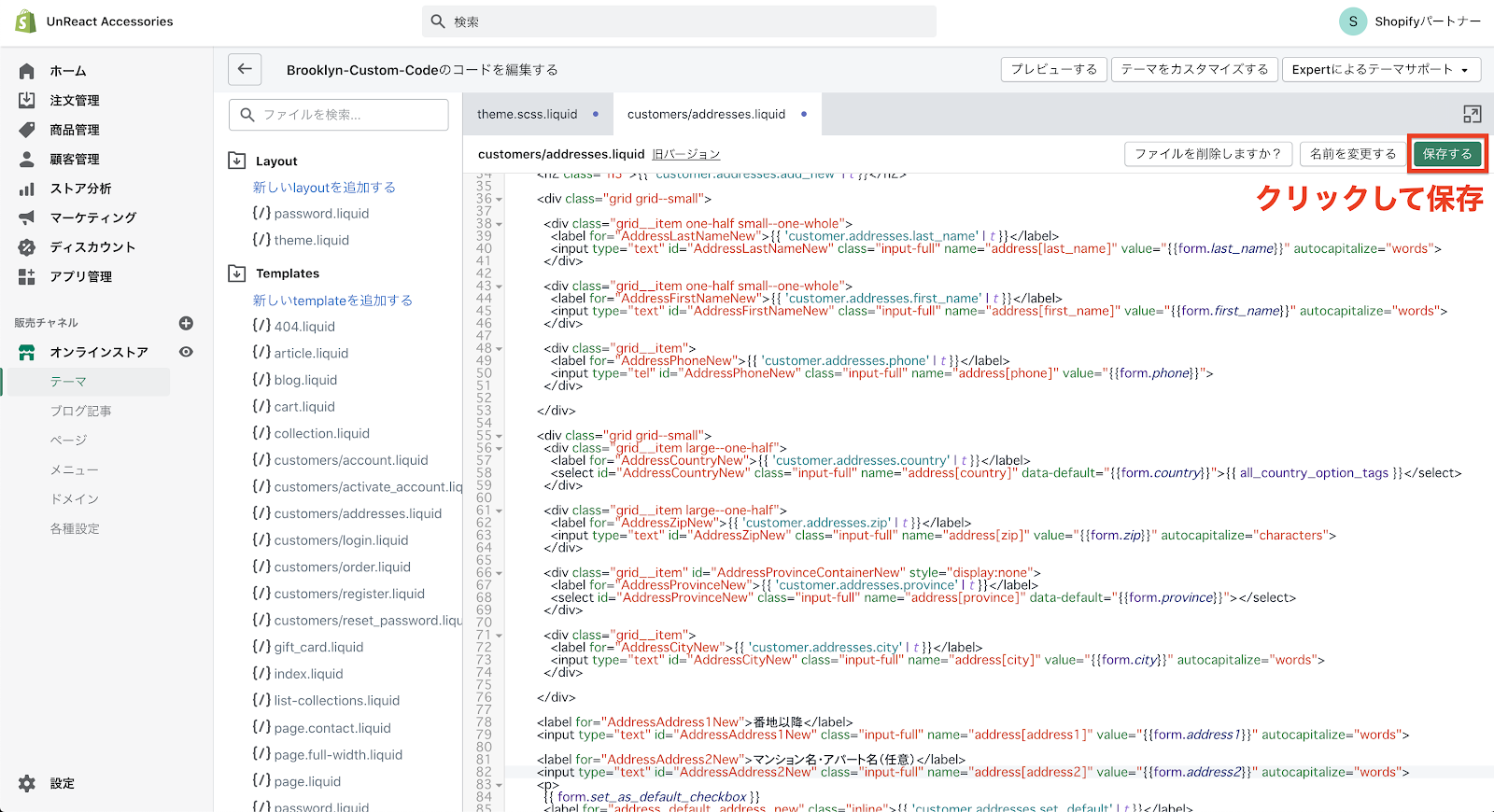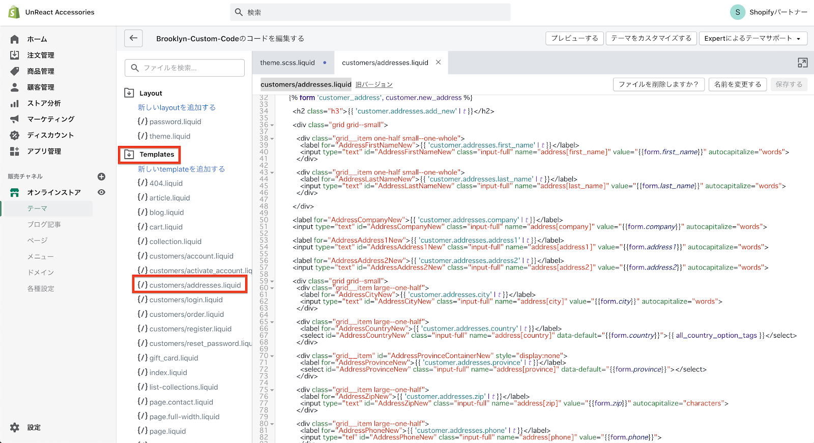 コードの編集画面へ移動したら、「Templates」フォルダの中にある「customers/addresses.liquid」を開きます。このファイルに、住所登録ページのコードが書いてあります。