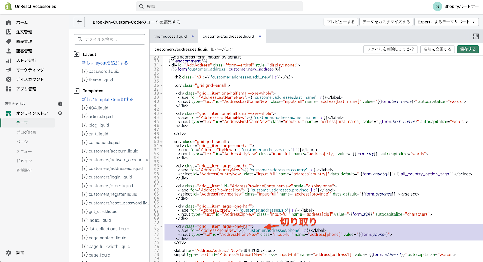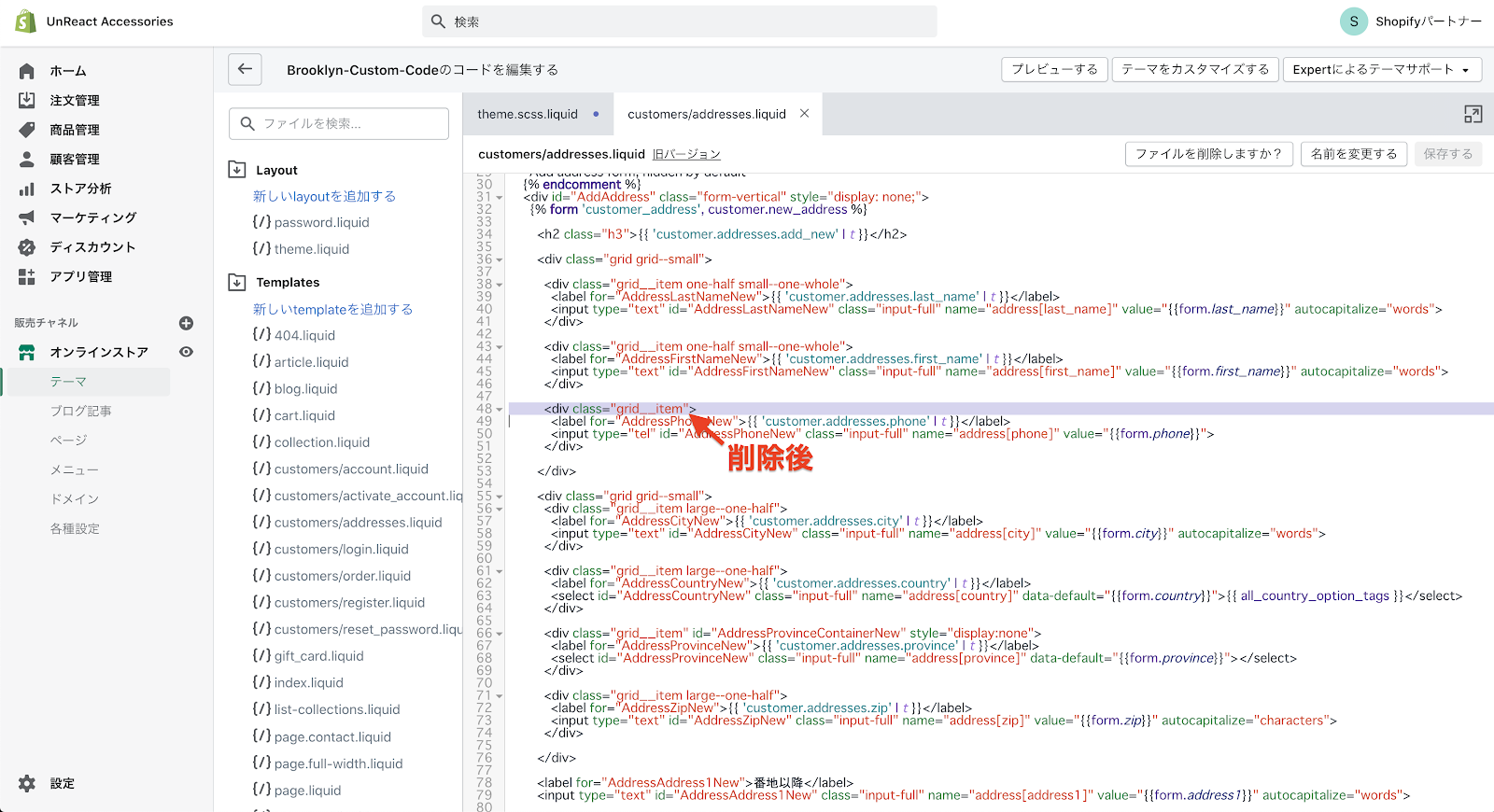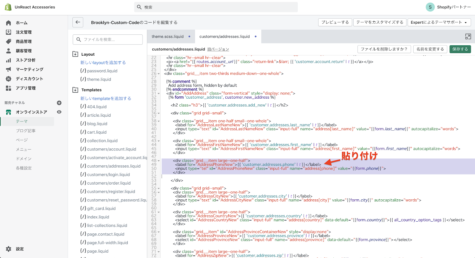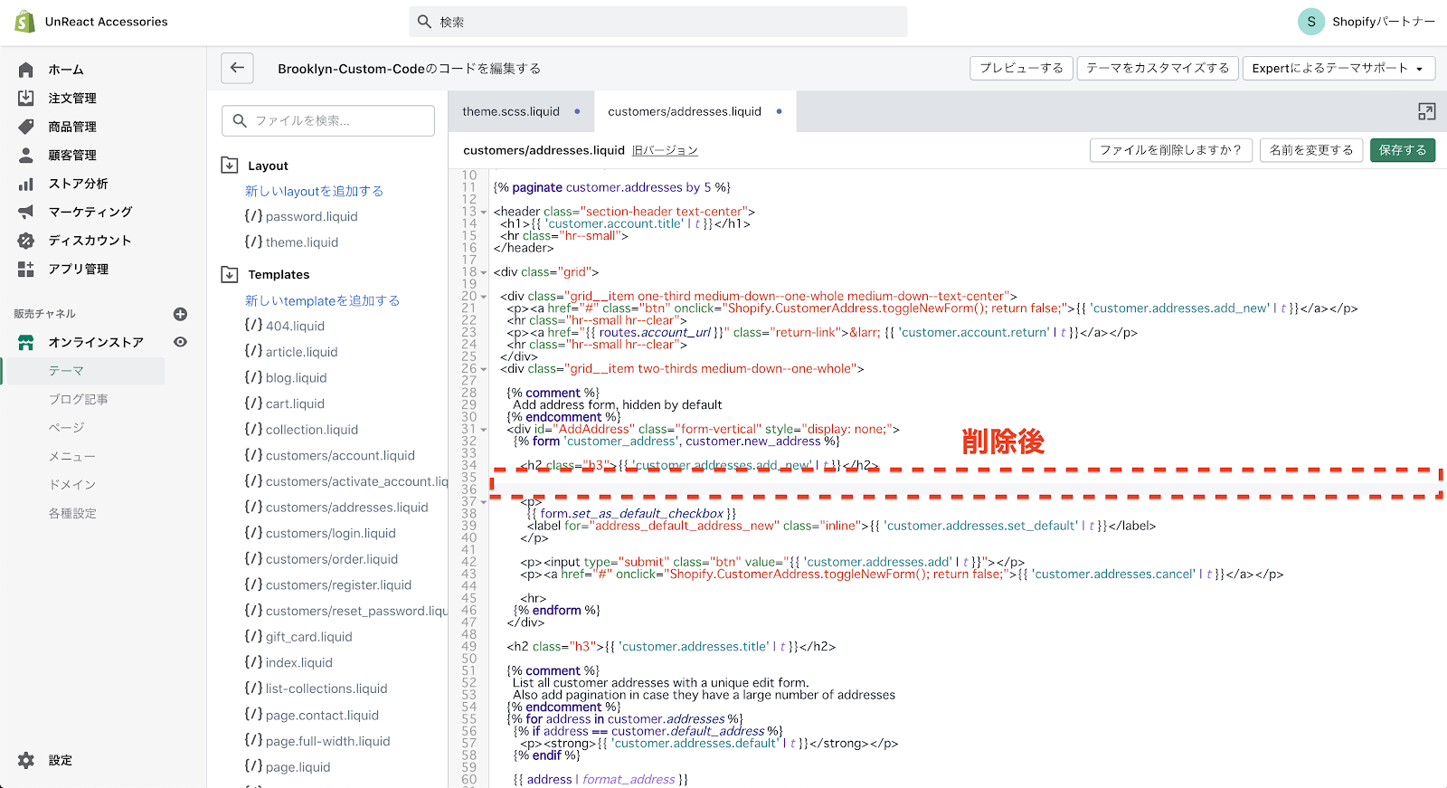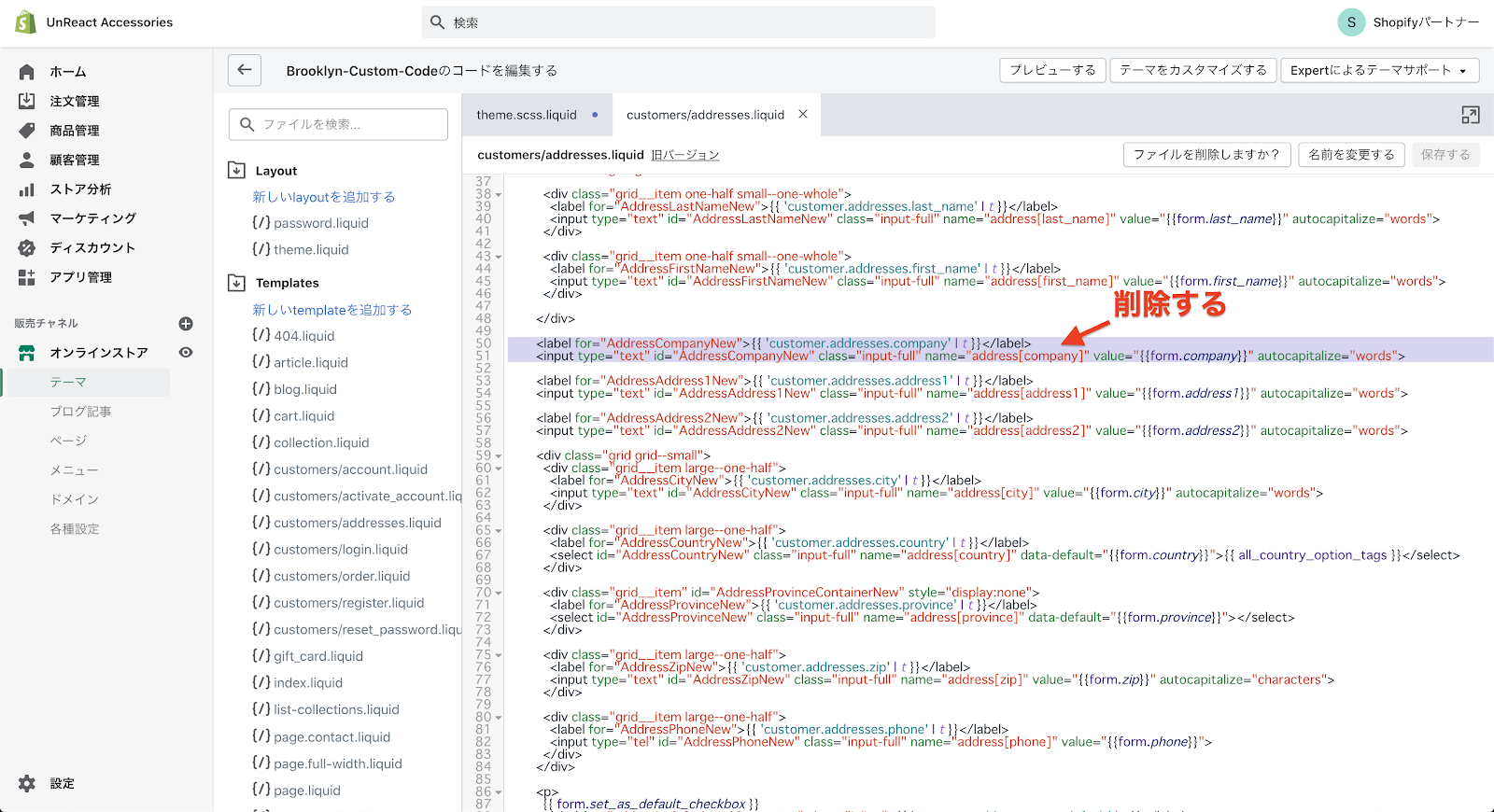 コードの編集画面へ移動したら、「Templates」フォルダの中にある「customers/addresses.liquid」を開きます。このファイルに、住所登録ページのコードが書いてあります。