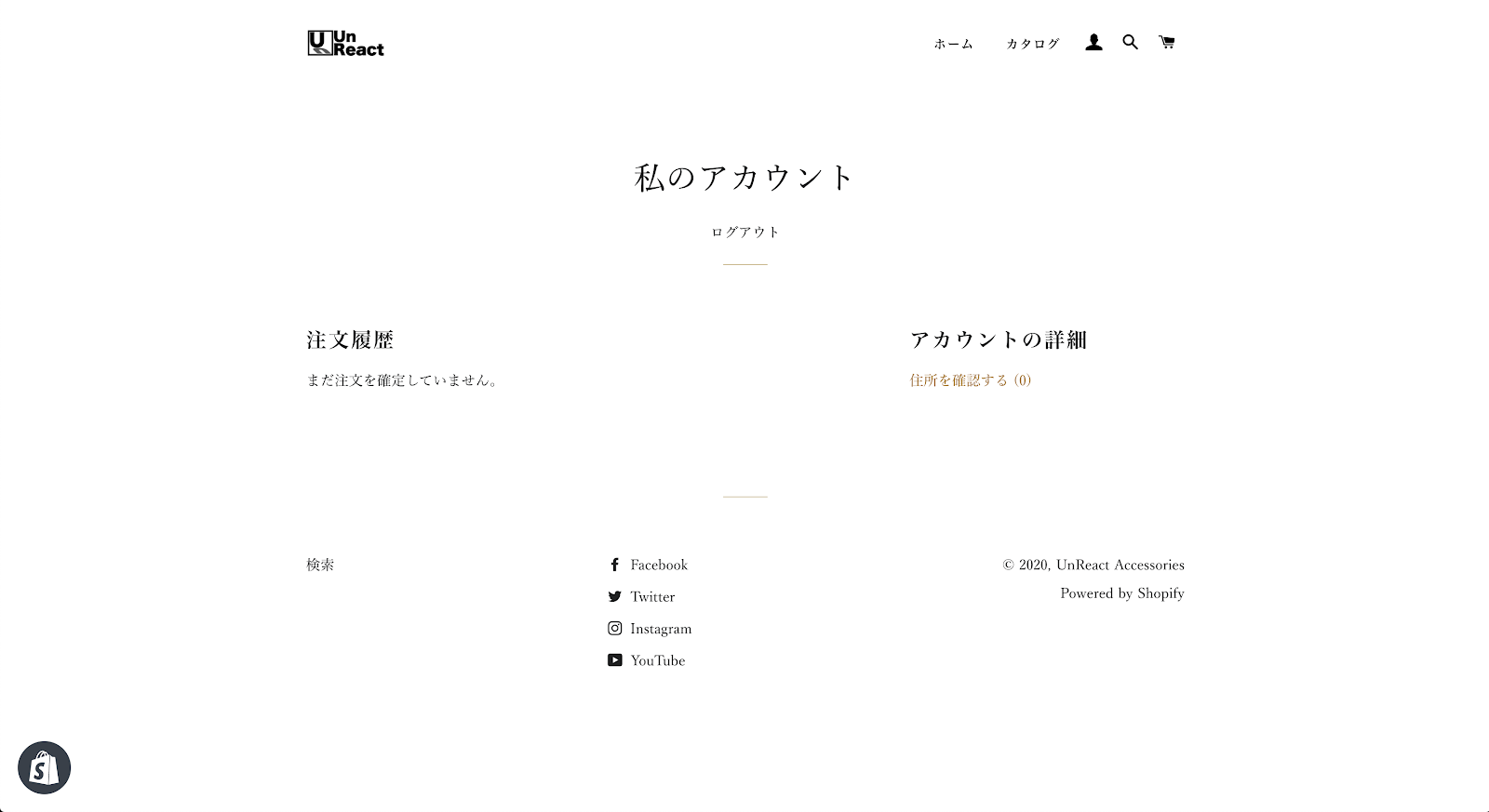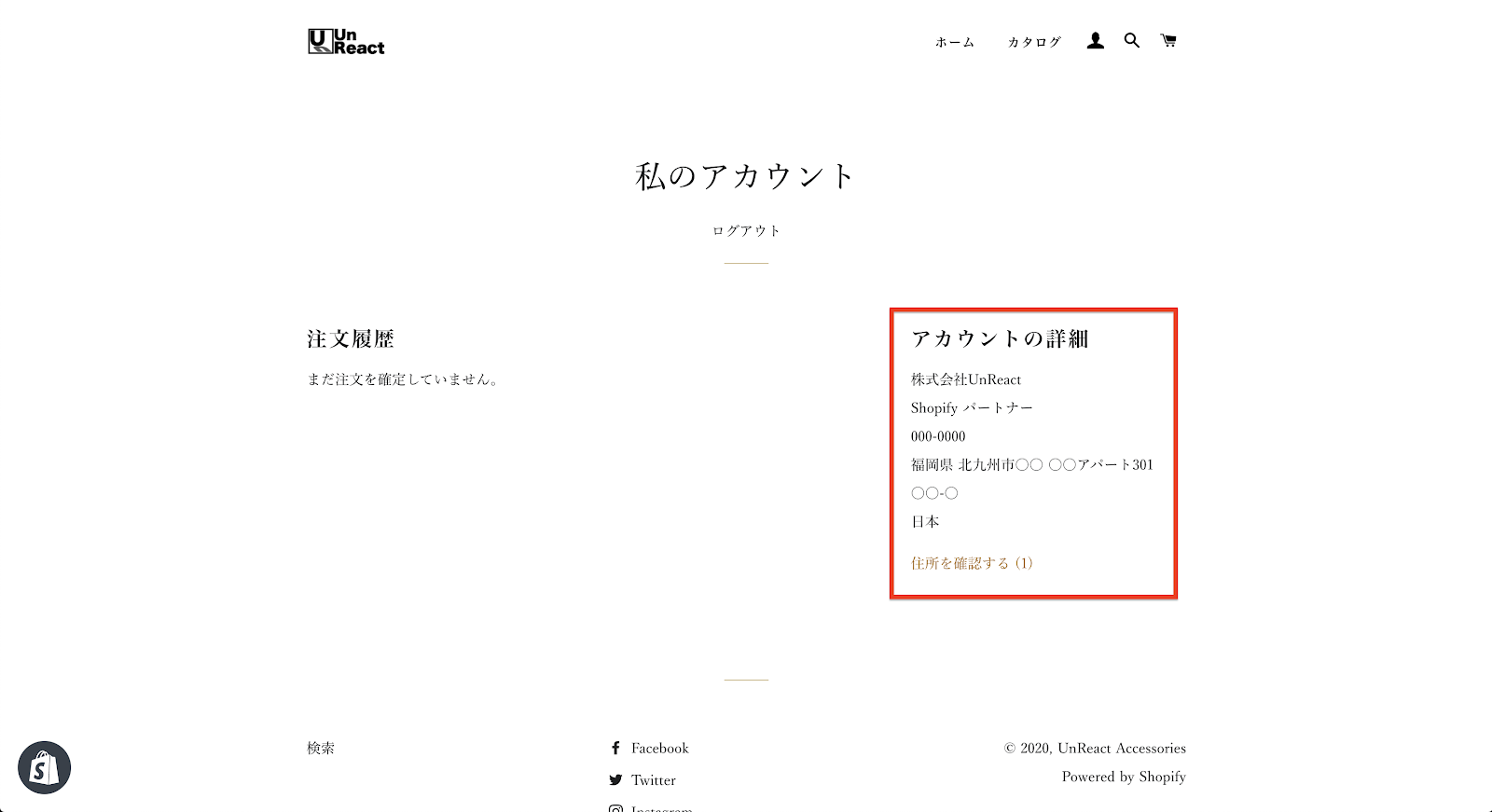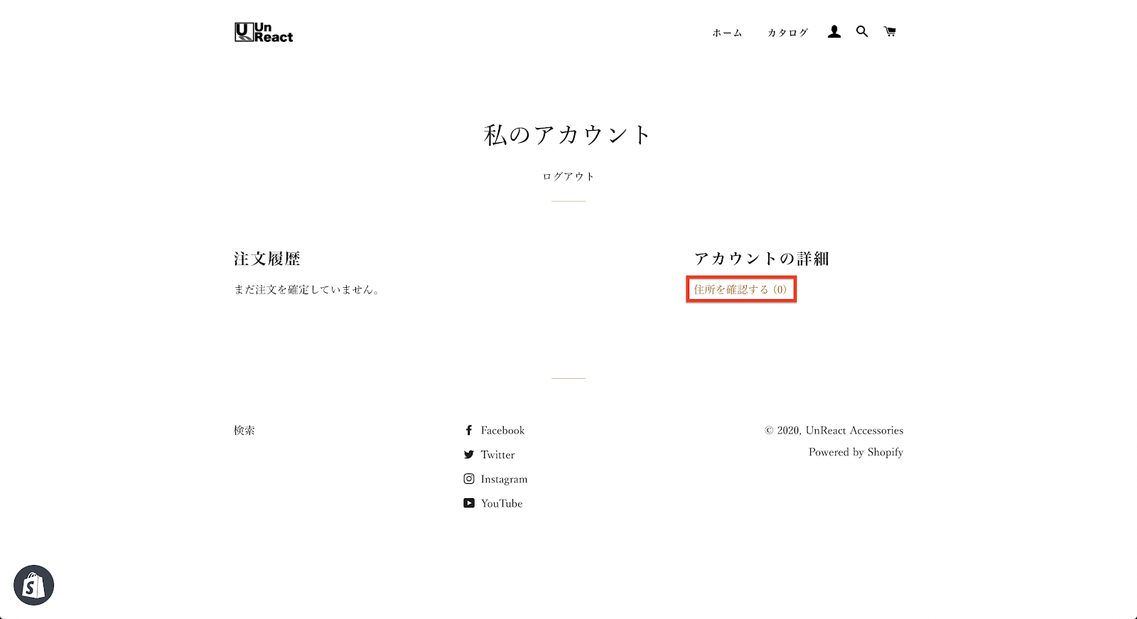 アカウントページでは、そのストアでの注文履歴や、住所などの情報を見ることができます。