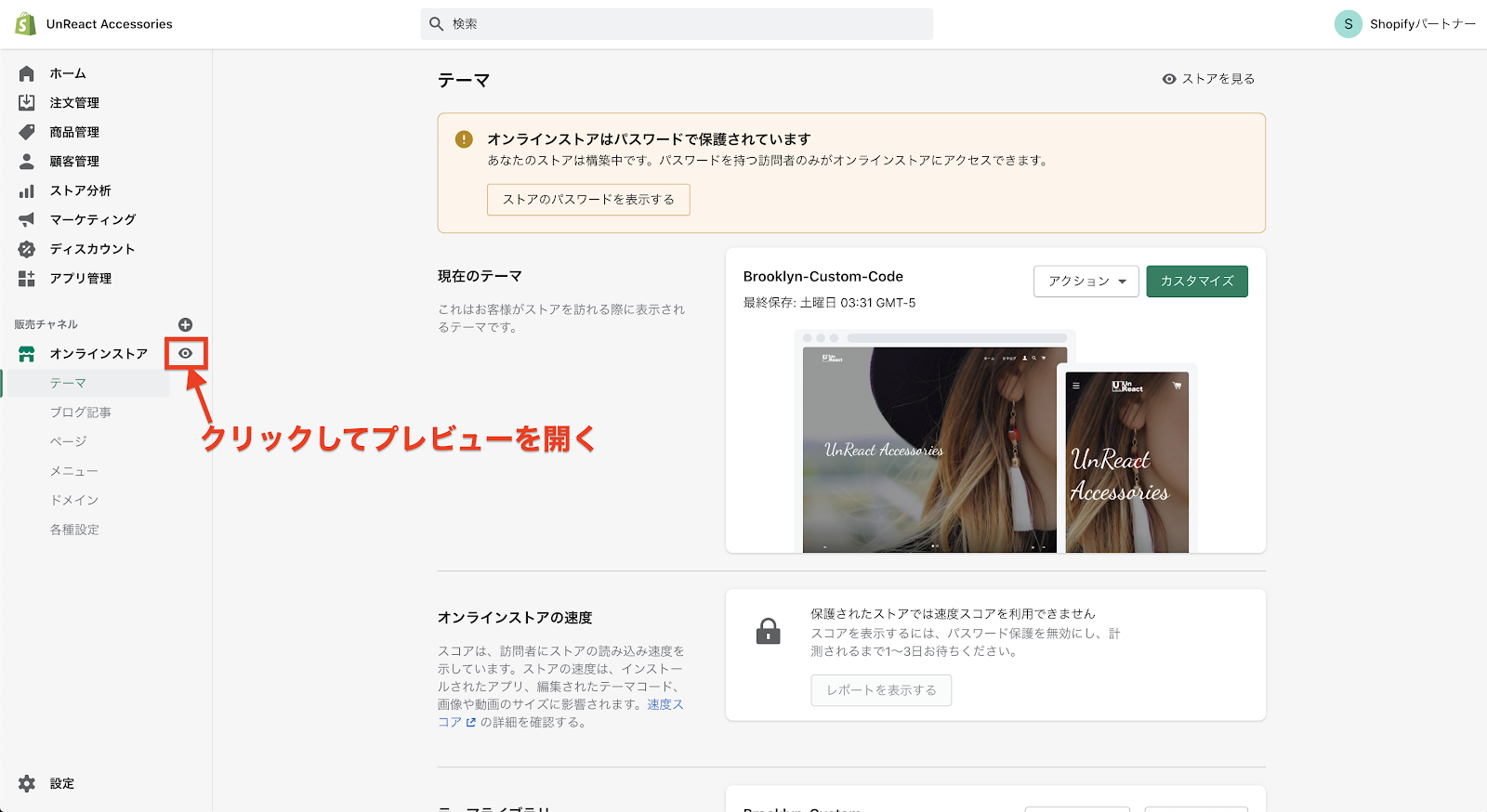 アカウントページがストアに反映されていることを確認します。ストアのプレビューを開きます。