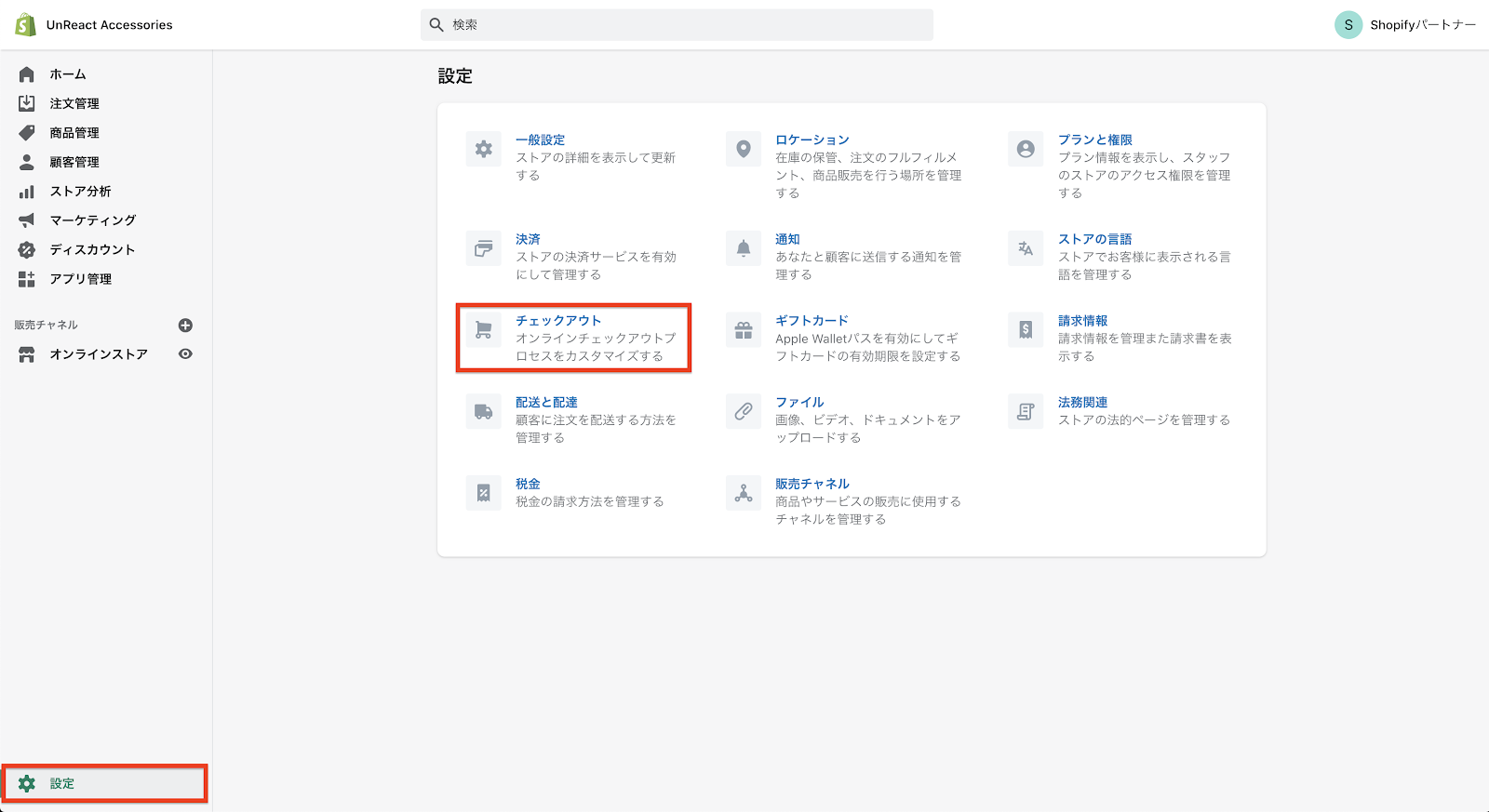 ストアの管理画面で「設定 > チェックアウト」へと進みます。