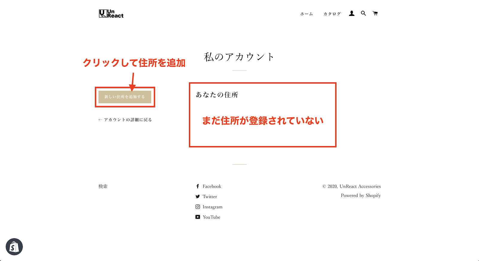 アカウントの設定直後は、住所が設定されていないので、「新しい住所を追加する」をクリックして住所を追加します。