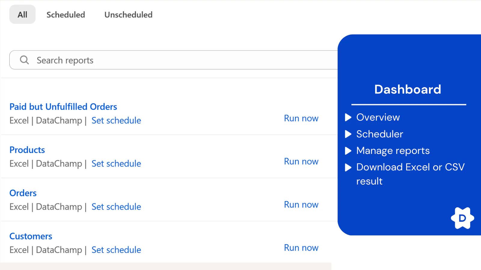 主な機能 | 売上、在庫、注文の詳細レポート / CSV、Excelエクスポート / スケジュール自動送信 / カスタムレポート作成 / 事前構築テンプレート |