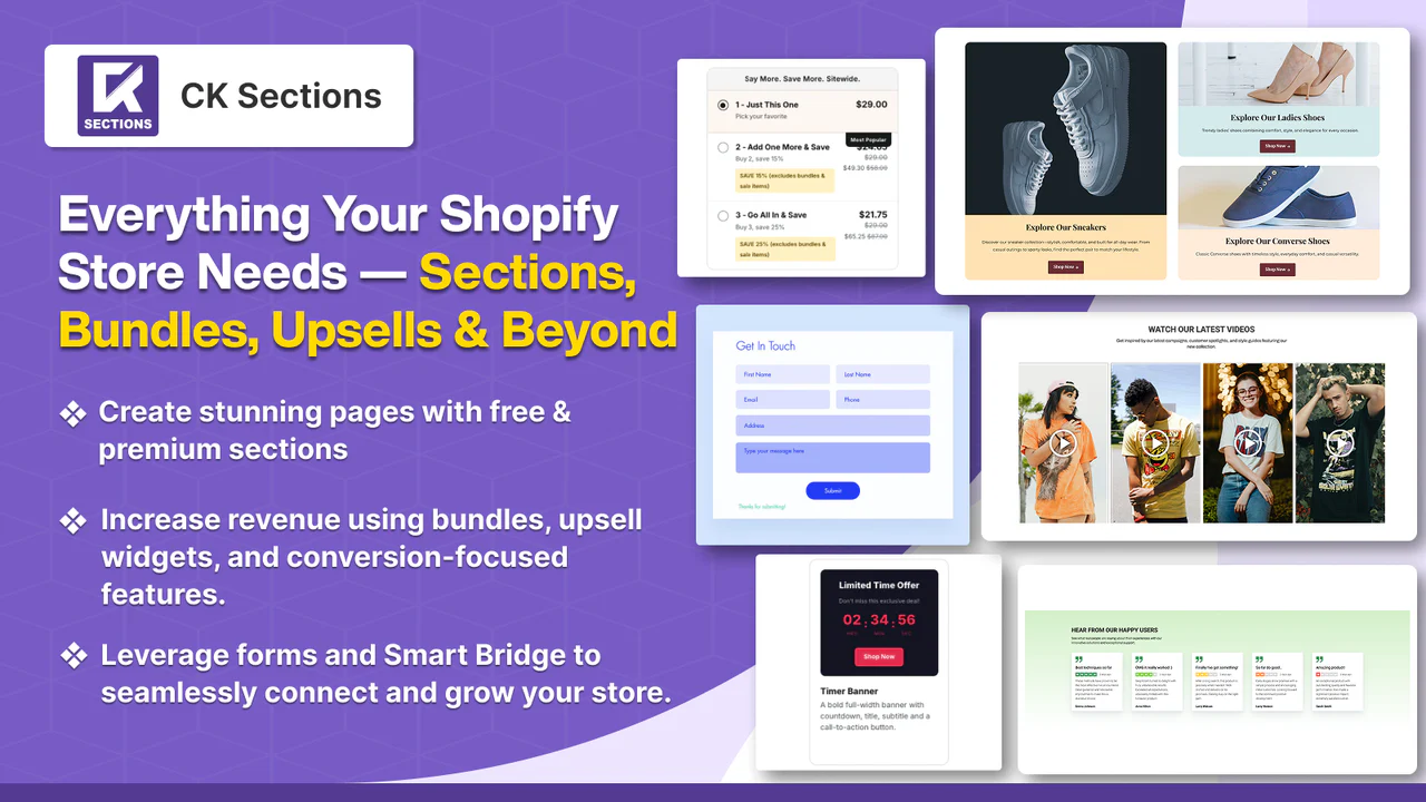 Shopifyを使ってみて「テーマに用意されたセクションだけではブランドを表現しきれない」と感じたときに役立つのがCK Sectionsです。コードを書かずに本格的なセクションを追加できるため、テスティモニアル、ヒーローバナー、機能紹介セクションなど、コンバージョン向上に欠かせないパーツを手軽に設置できます。セクション単位で購入できるので、必要なパーツのみを追加しコストを抑えられるのも特徴です。プレミアムプランにアップグレードすれば30個のプレミアムセクションが使い放題になり、ファイルアップロード付きのお問い合わせフォームや独自割引機能など、より高度な施策もノーコードで実現できます。Shopify PlusプランのストアではChekoutページやサンキューページでもセクションを使えるので、購入直後のお客様に対しても訴求を強化したい運営者にはぴったりでしょう。英語ベースのアプリですが、管理画面のUIは比較的わかりやすく作られており、デザインに強いマーケターの頼もしい相棒になってくれます。