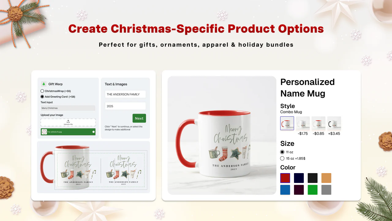 | 主な機能 | テキスト、スウォッチ、ドロップダウン、ファイルアップロード、価格追加、条件ロジック、ライブプレビュー、カート編集、ギフトラップ、サイズチャート、複数バリエーション画像 |