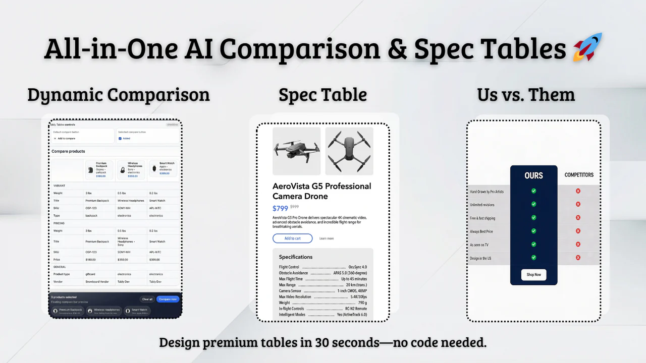 | ハイライト | 商品比較表・仕様表を簡単作成 / variants・metafields・metaobjects対応 / AIで表の下書き作成 |
