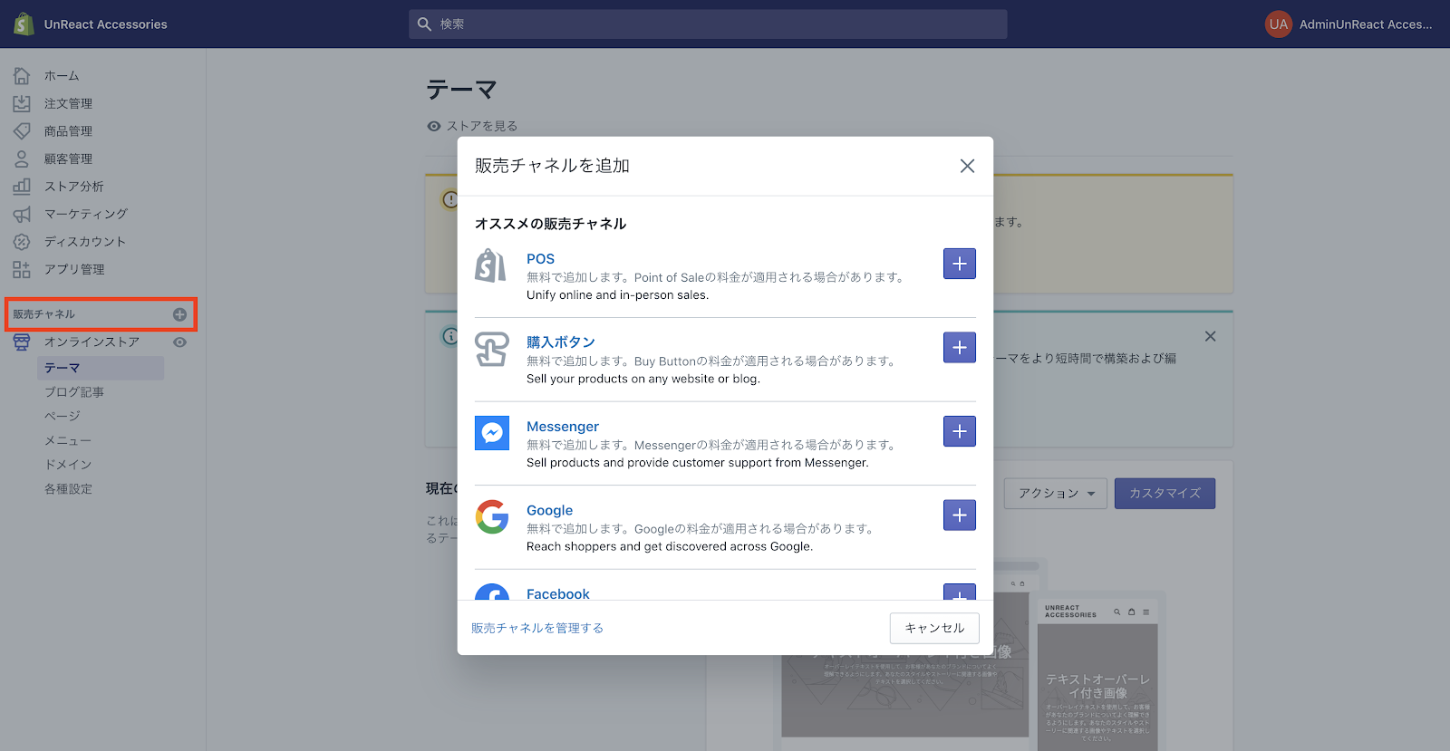 「販売チャネル」という項目にある「+(プラス)」ボタンをクリックすると、オンラインストア以外の販売チャネルを追加することができます。販売チャネルとは、販売の流通経路のことです。