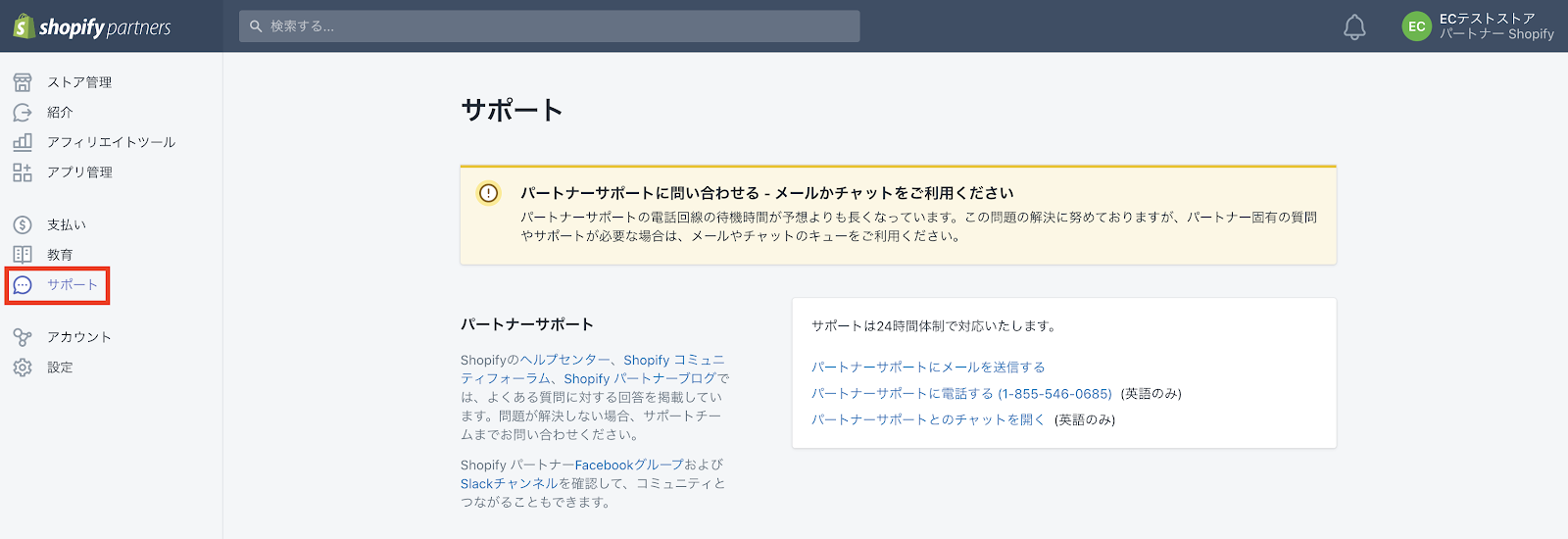 「サポート」の項目からは、パートナーサポートに連絡することができます。サポートは 24 時間体制ですが、電話とチャットについては英語での対応になります。