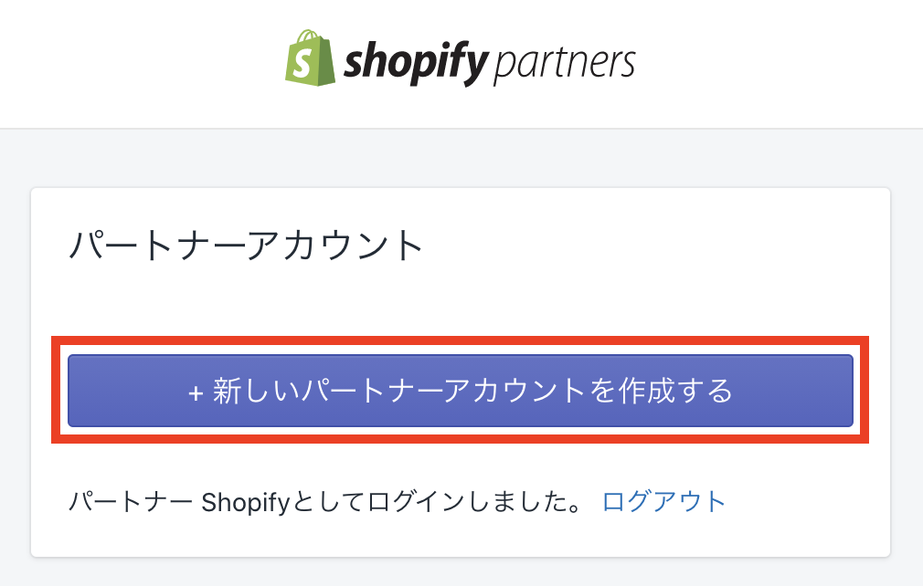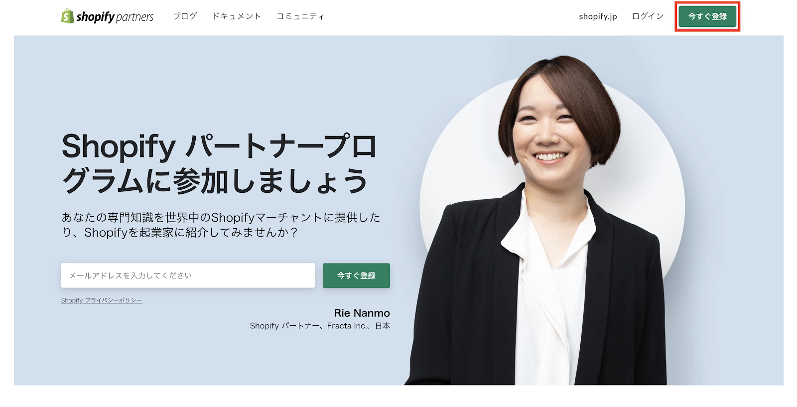 すでに Shopify パートナーのアカウントを持っている方は、ログインしてパートナー管理画面に進んでください。(ここからの説明は飛ばして次の項目に進んでください)
