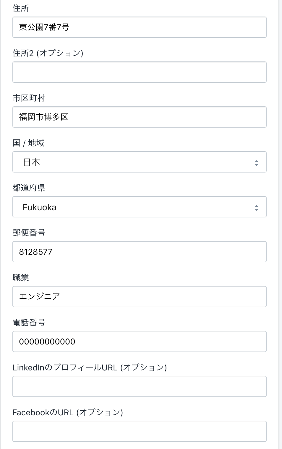 「ウェブサイト(オプション)」は、自分のウェブサイトがあれば入力します。(オプション)と表記してある項目は、任意の項目なので入力しなくても大丈夫です。