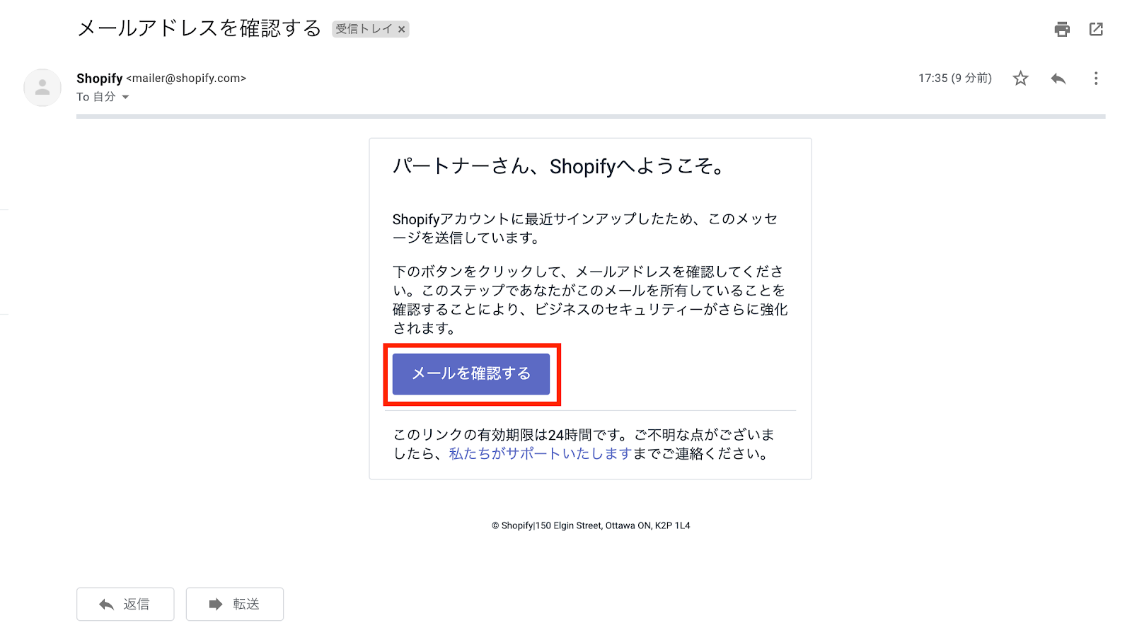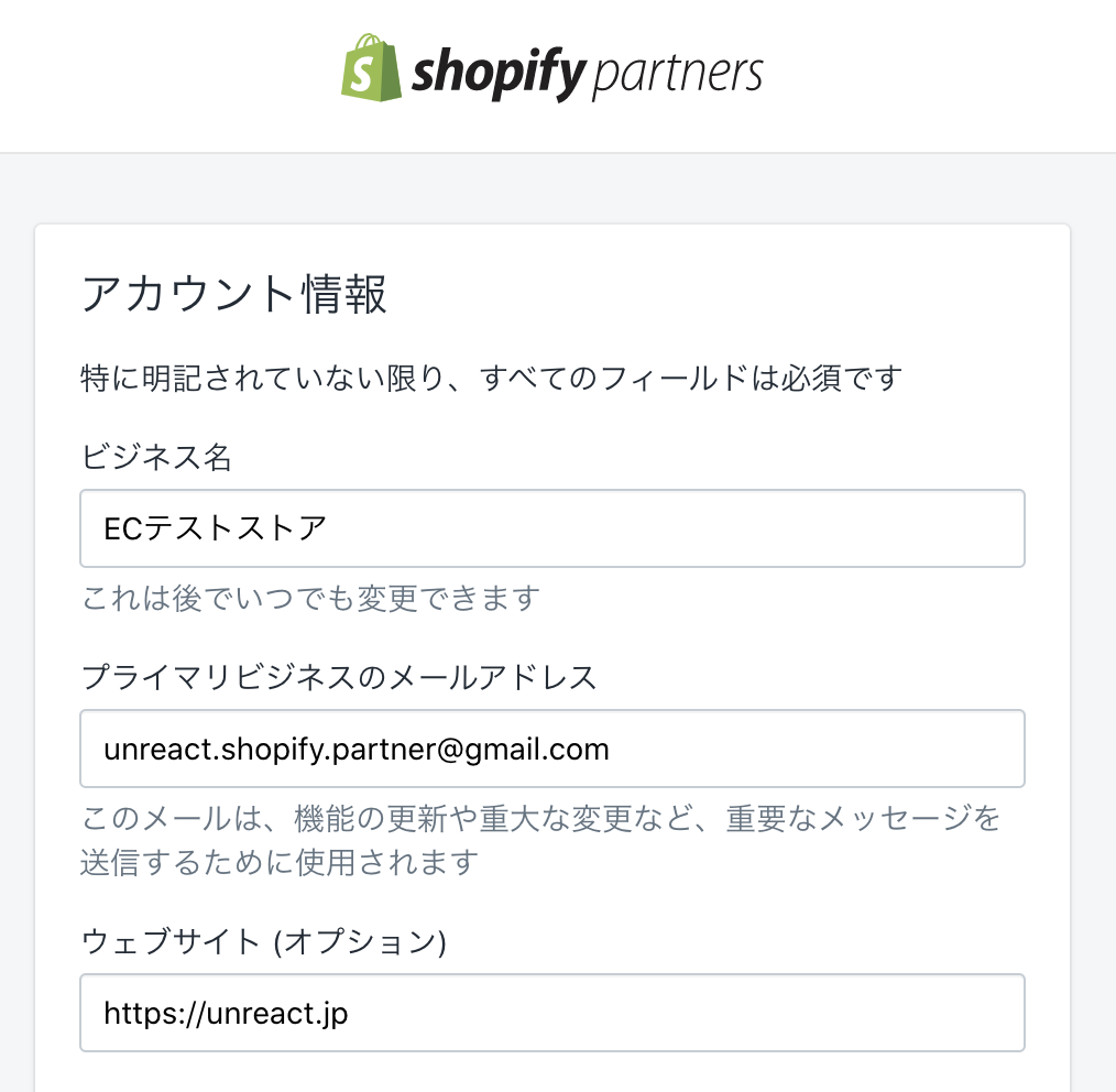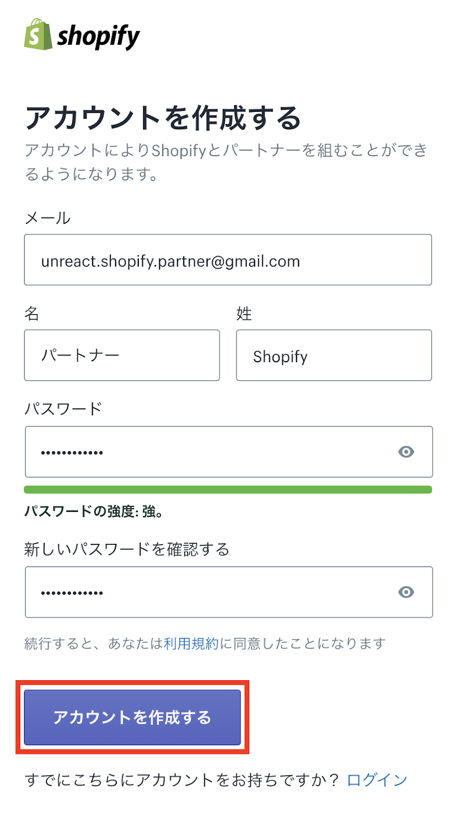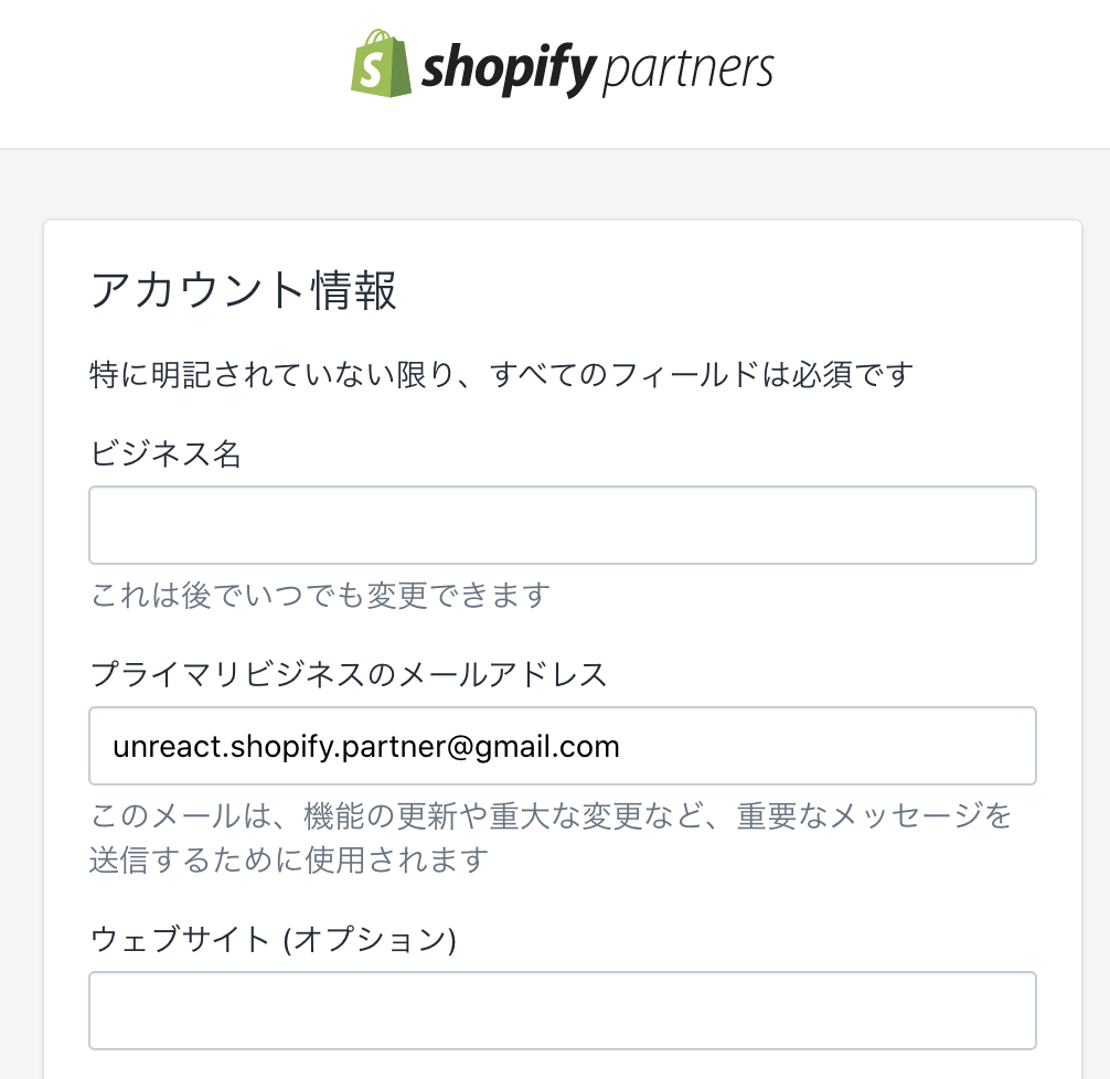 まず、事前に準備してもらっていたメールアドレスを用いて Shopify パートナーアカウントを作成していきます。
