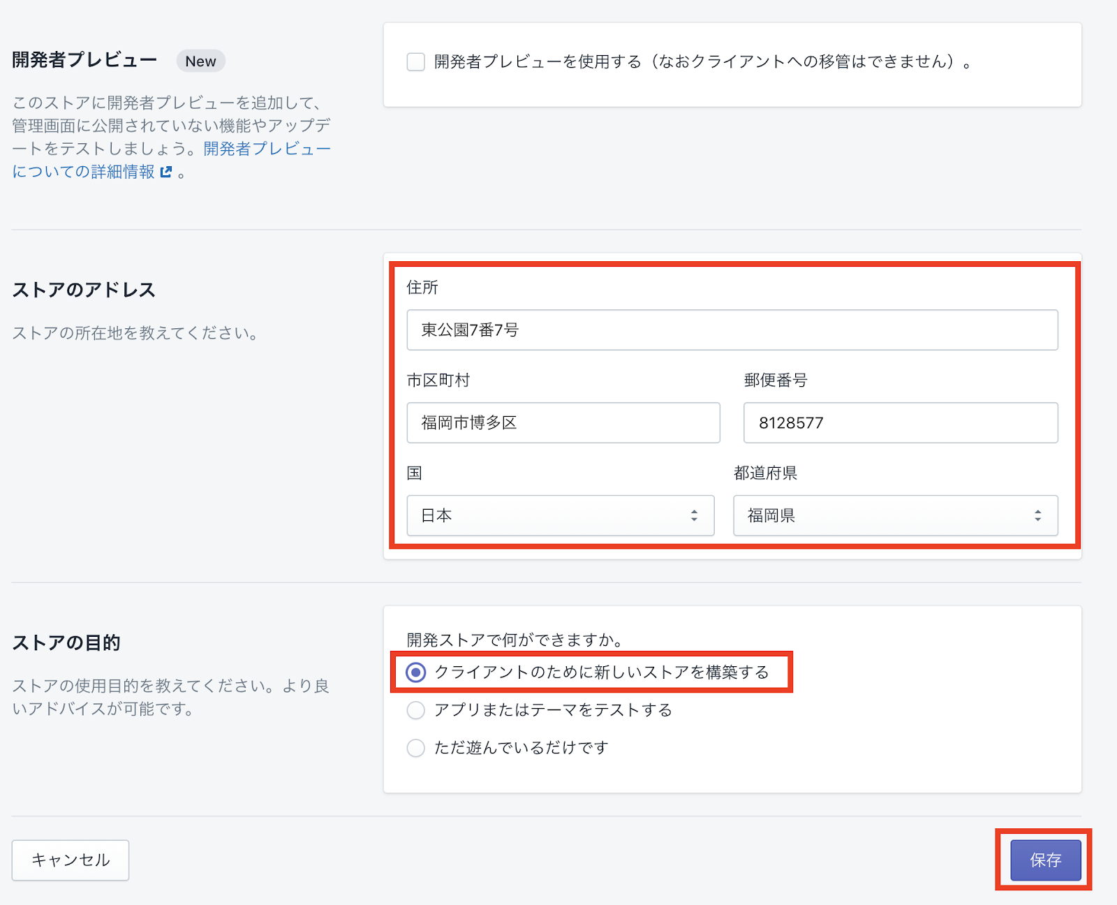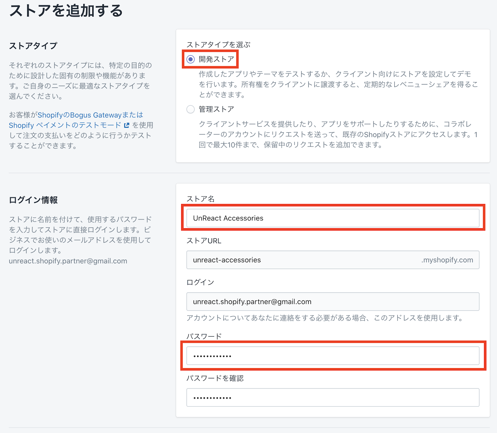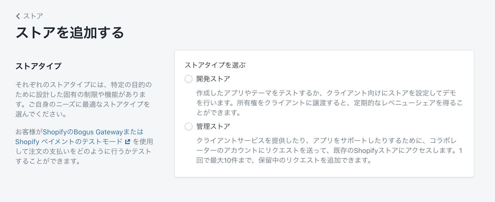 今回は、クライアントの依頼でストアを構築する場合を想定しているので、「開発ストア」を選択します。