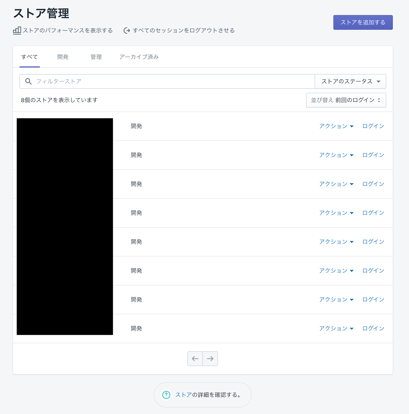 「ストア管理」の項目では、これから構築するストアを追加したり、すでに作っているストアを管理したりすることができます。