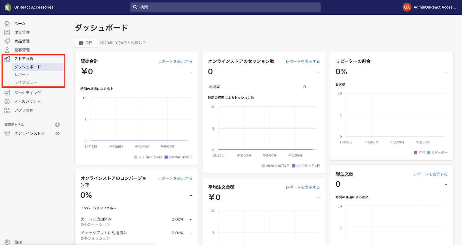 「ダッシュボード」では、販売金額の合計やユーザーのリピート率、オンラインストアのコンバージョン率など様々な分析結果を表示してくれます。ストアの分析は、もちろんベーシックプランでも使えます。
