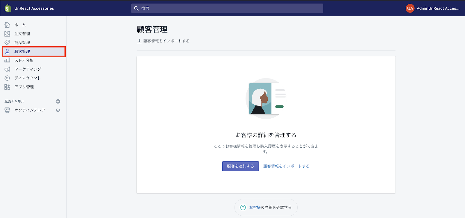 「顧客管理」の項目では、ユーザーの顧客の情報を管理することができます。運営するストアでの顧客の購入履歴などが表示されます。