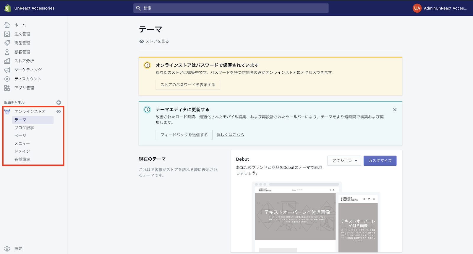「オンラインストア」の項目では、ストアのテーマやブログ記事の管理をすることができます。それぞれの項目については、ロードマップを進めていく上で説明していくことになるので、説明は省略します。
