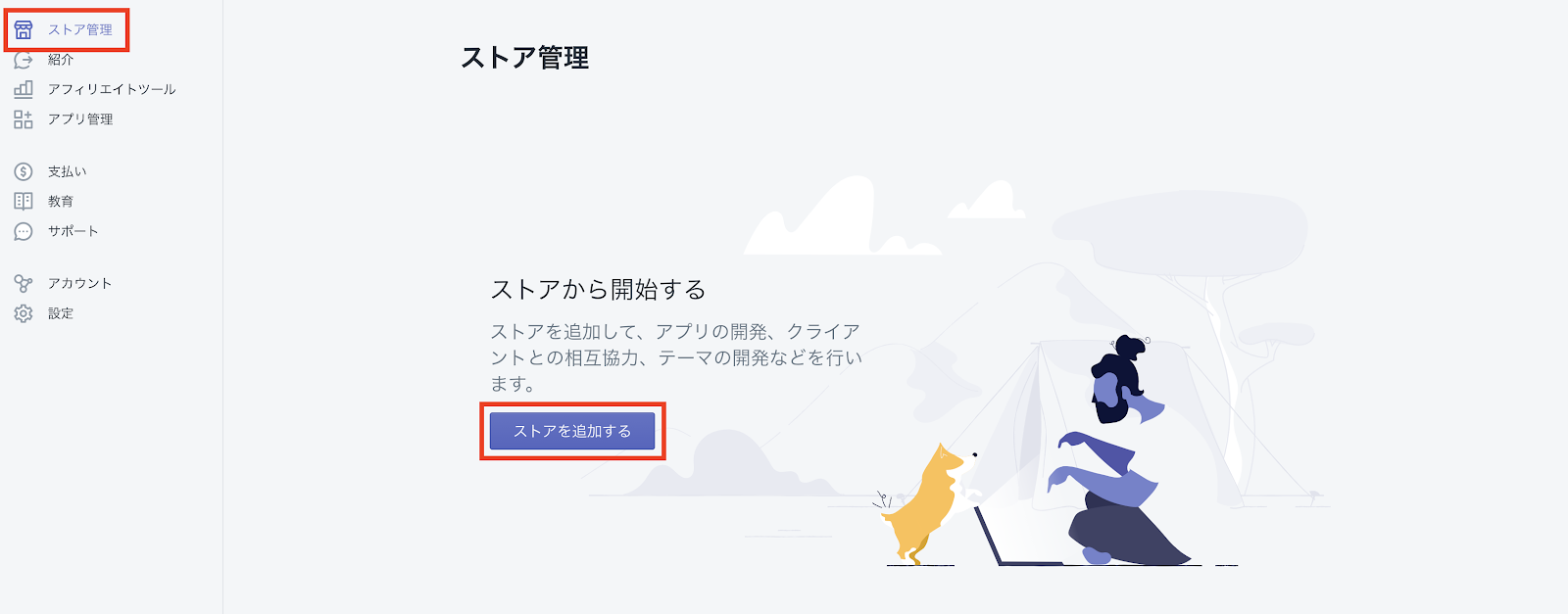 ダッシュボードの左のメニューから「ストア管理」をクリックします。ストア管理メニューが表示されたら、「ストアを追加する」をクリックします。