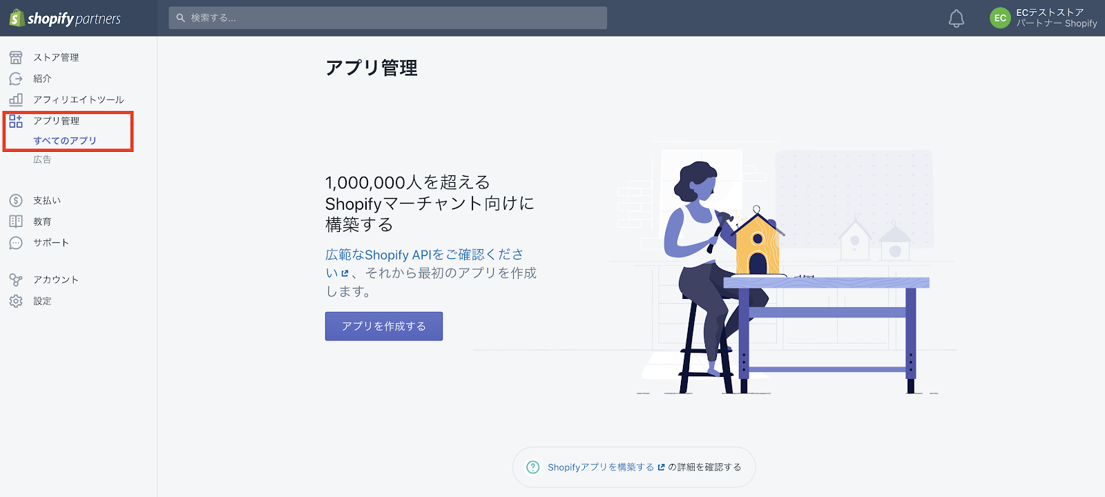 「アプリ管理」の項目では、Shopify のマーチャント向けにアプリを構築することができます。