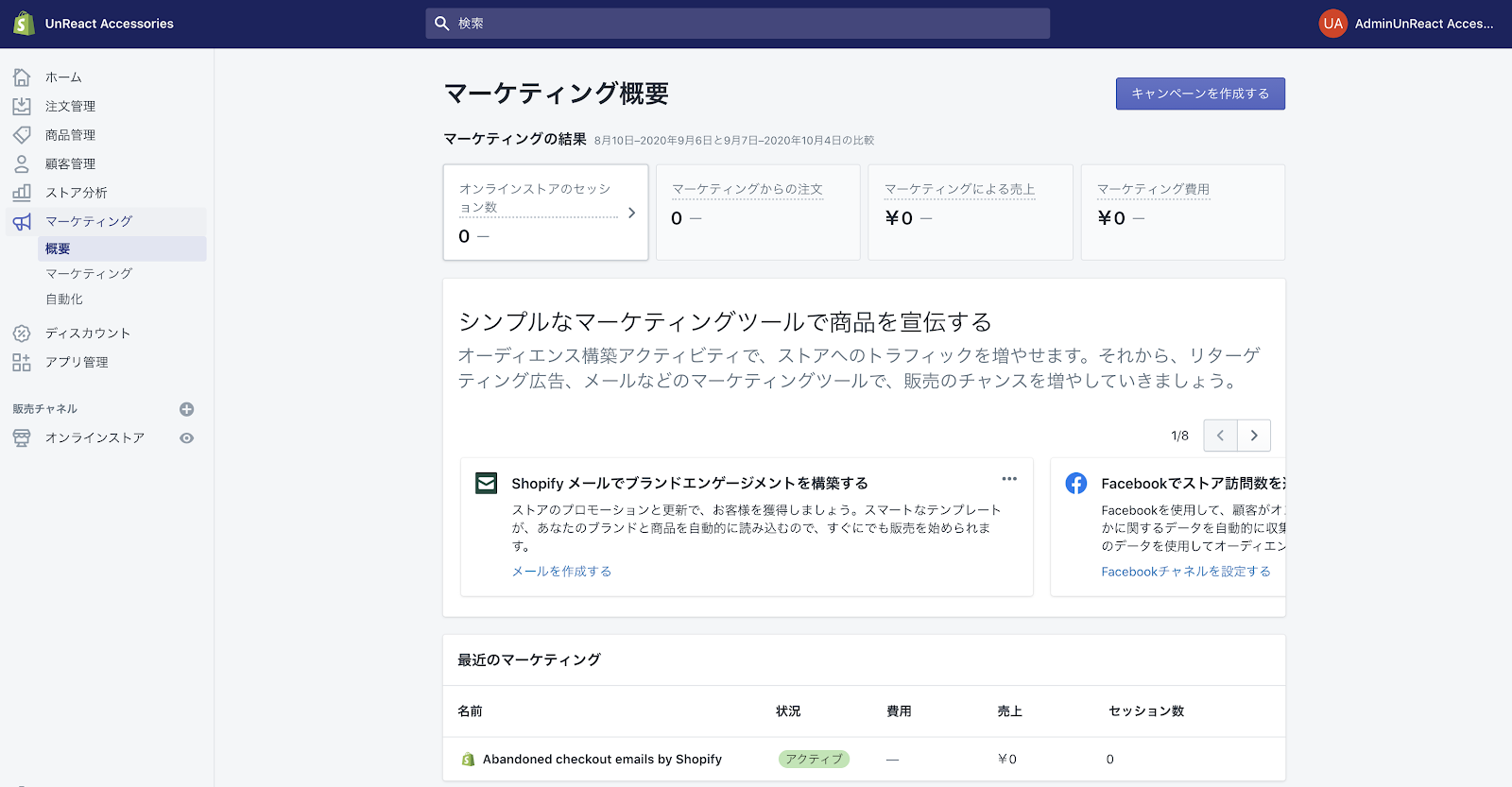 「マーケティング」の項目では、ストアのマーケティングについて管理することができます。Shopify メールによるマーケティングや Facebook によるユーザーの追跡を行うことができます。また、アプリを用いたマーケティングも追加することが可能です。