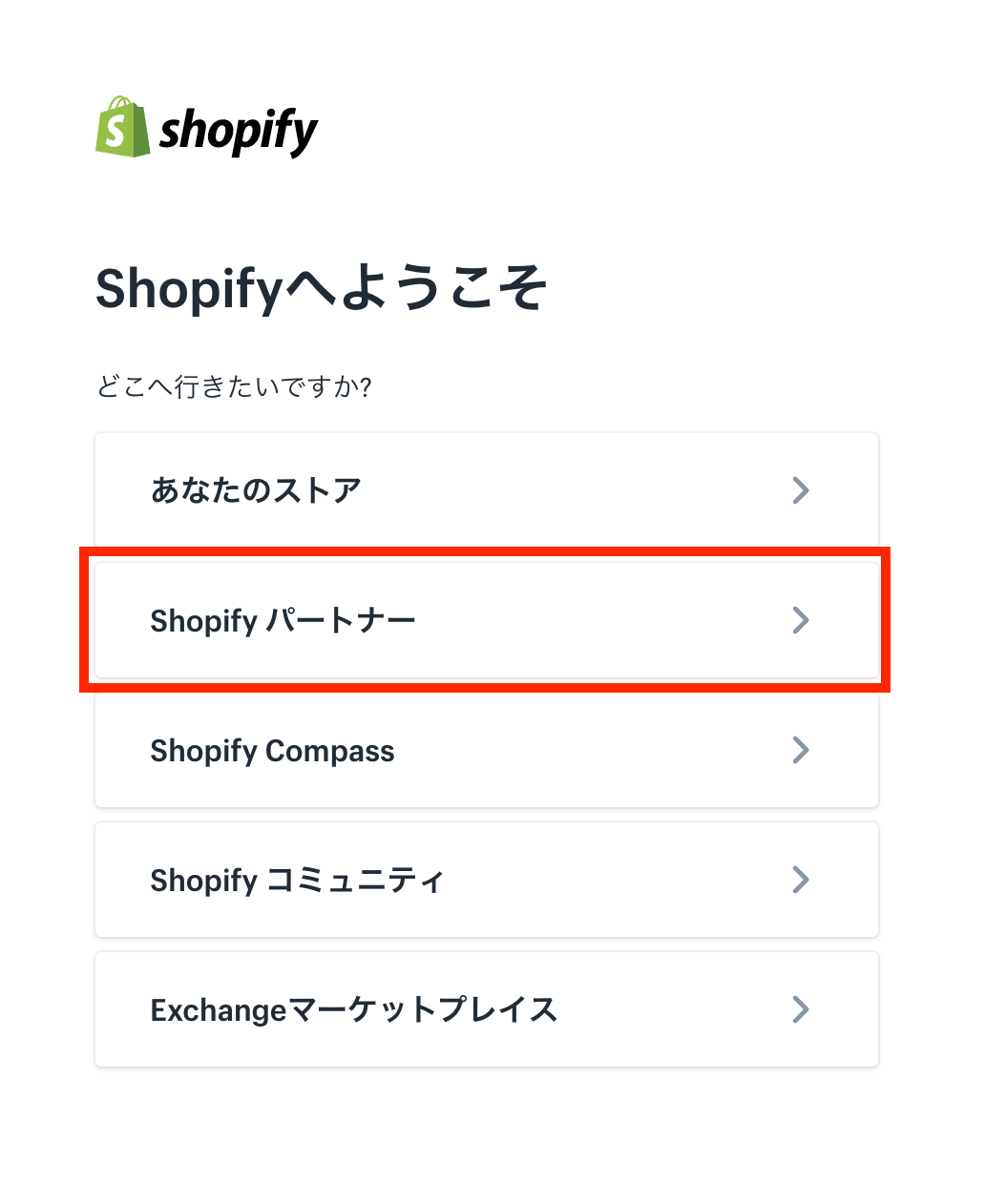 Shopify へようこそと表示された画面に遷移しますので、「Shopify パートナー」クリックします。