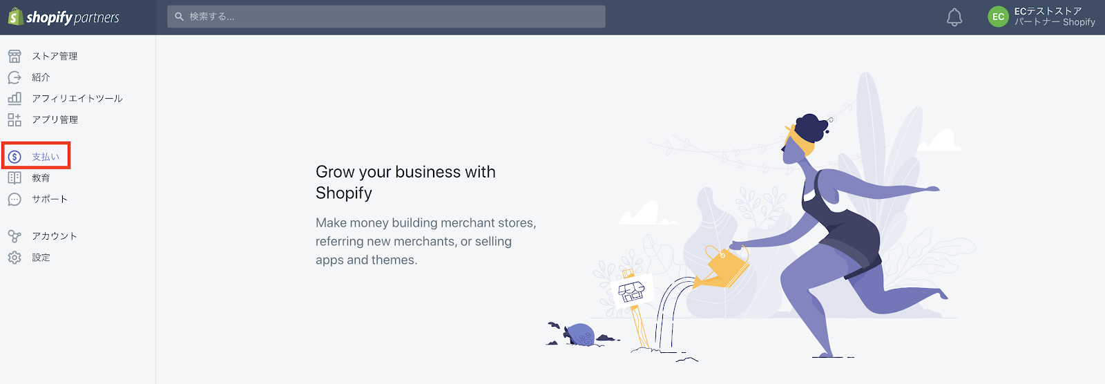 「支払い」の項目では、Shopify パートナーとして受け取る報酬の支払いに関する情報が表示されます。