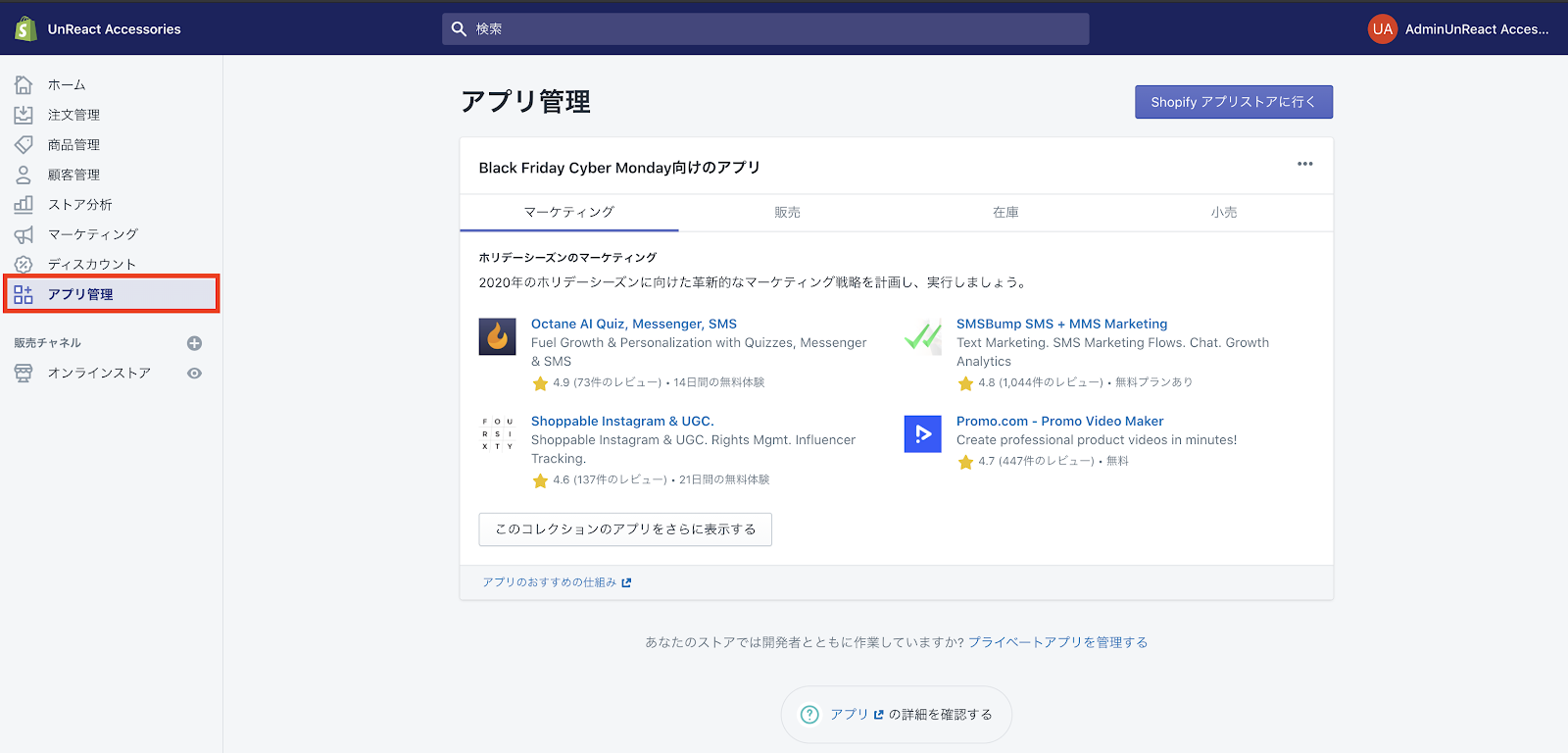 「アプリ管理」の項目では、ストアに導入しているアプリを管理することができます。画面右上にある「Shopify アプリストアに行く」からアプリをインストールしストアと連携させることが可能です。