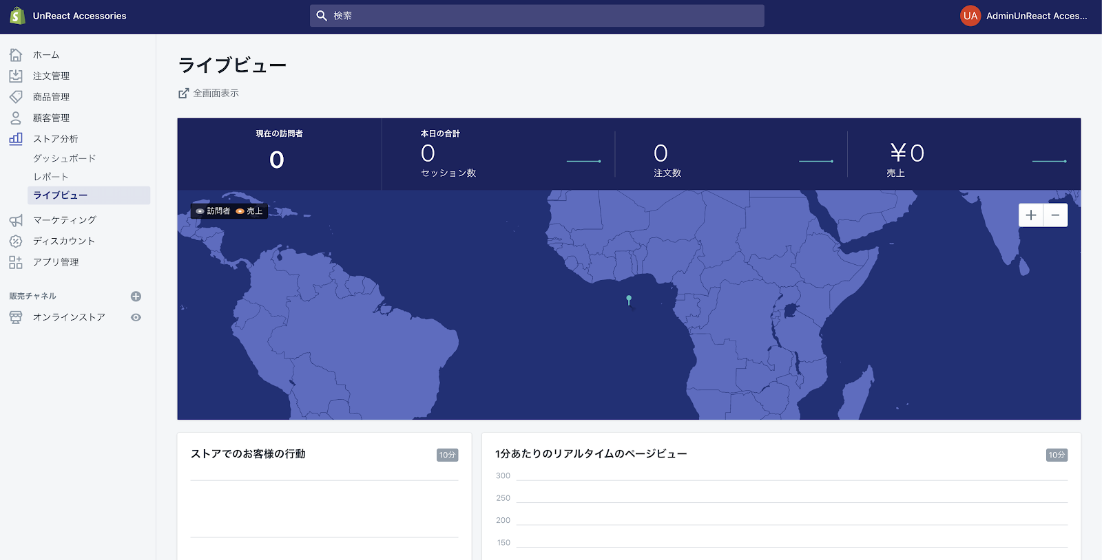「ライブビュー」では、ストアの現在の情報を見ることができます。その瞬間に何人がサイトを閲覧しているかやどの地域から閲覧されているかがわかりやすく表示されています。