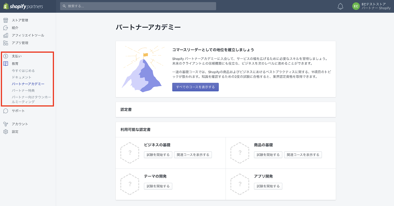 「教育 > ドキュメント」では、公式が用意したプログラムにより Shopify パートナーとしてのスキルを磨くことができます。