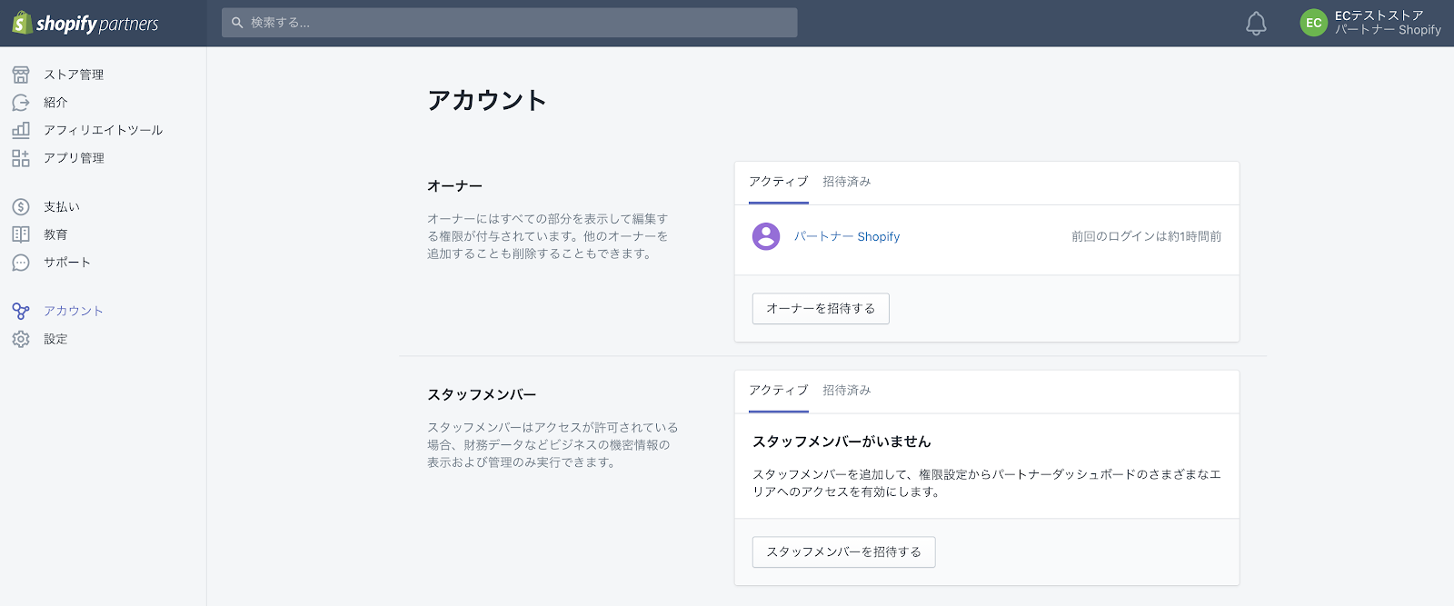 「アカウント」の項目では、ストアの構築や運営に関わるメンバーを招待することができます。
