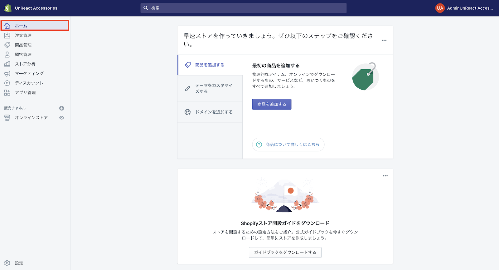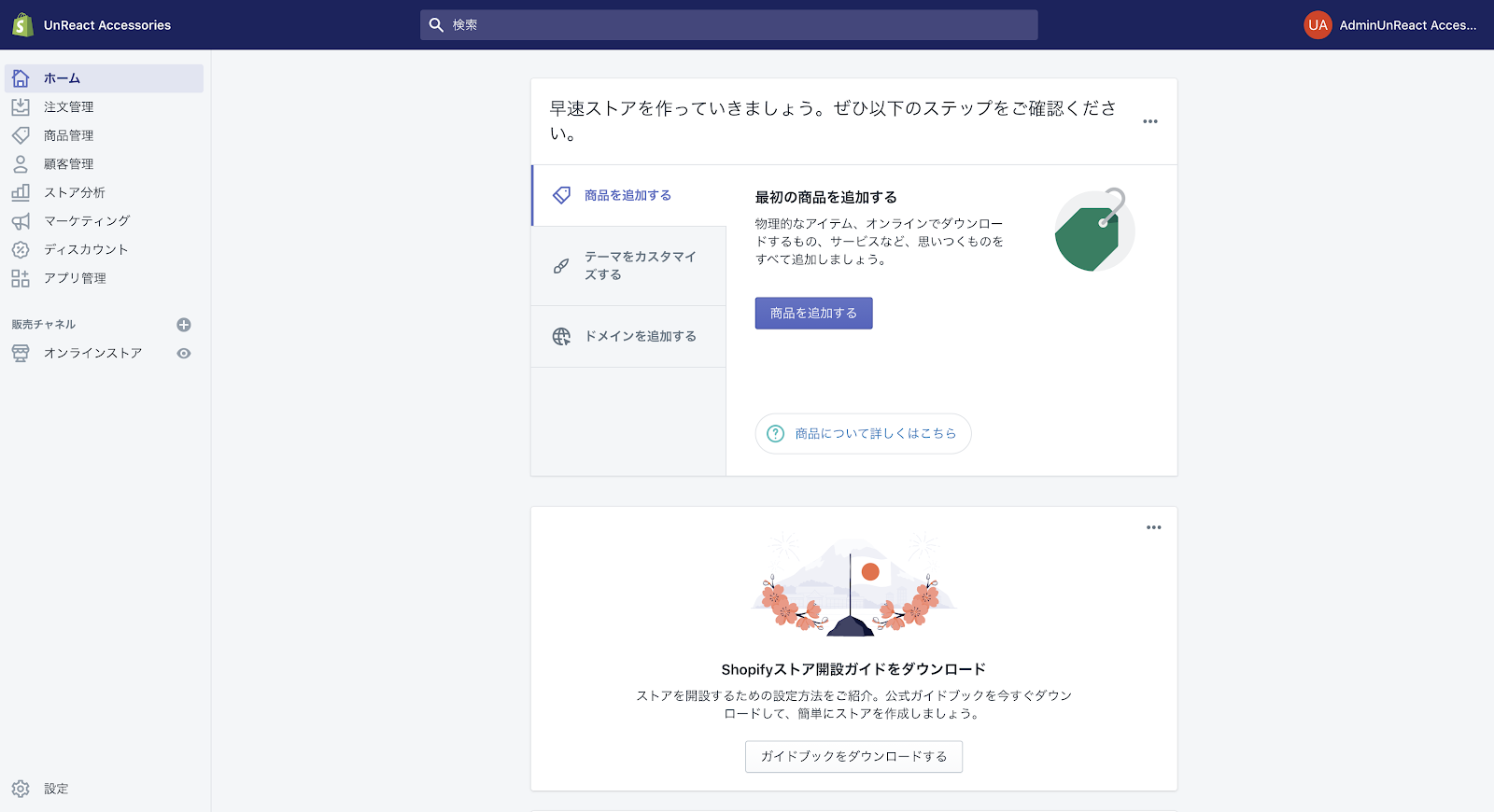 ストアの通常の管理画面が出てきたら、新しいストアの追加は完了です。