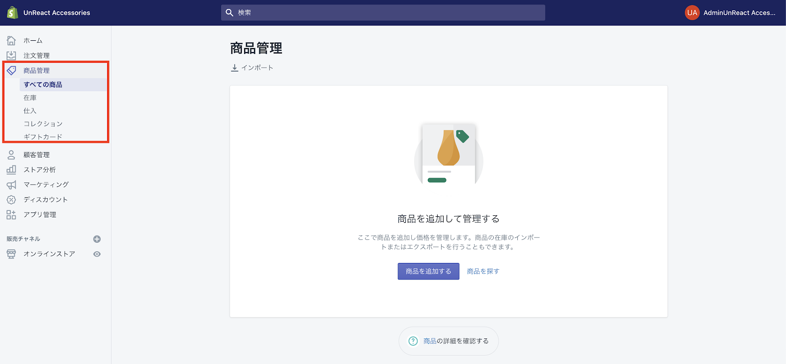 「商品管理」の項目では、ストアに商品の登録をしたり、在庫の管理をしたりすることができます。商品をカテゴリーごとにまとめたコレクションを作ることや、ギフトカードを発行することも可能です。
