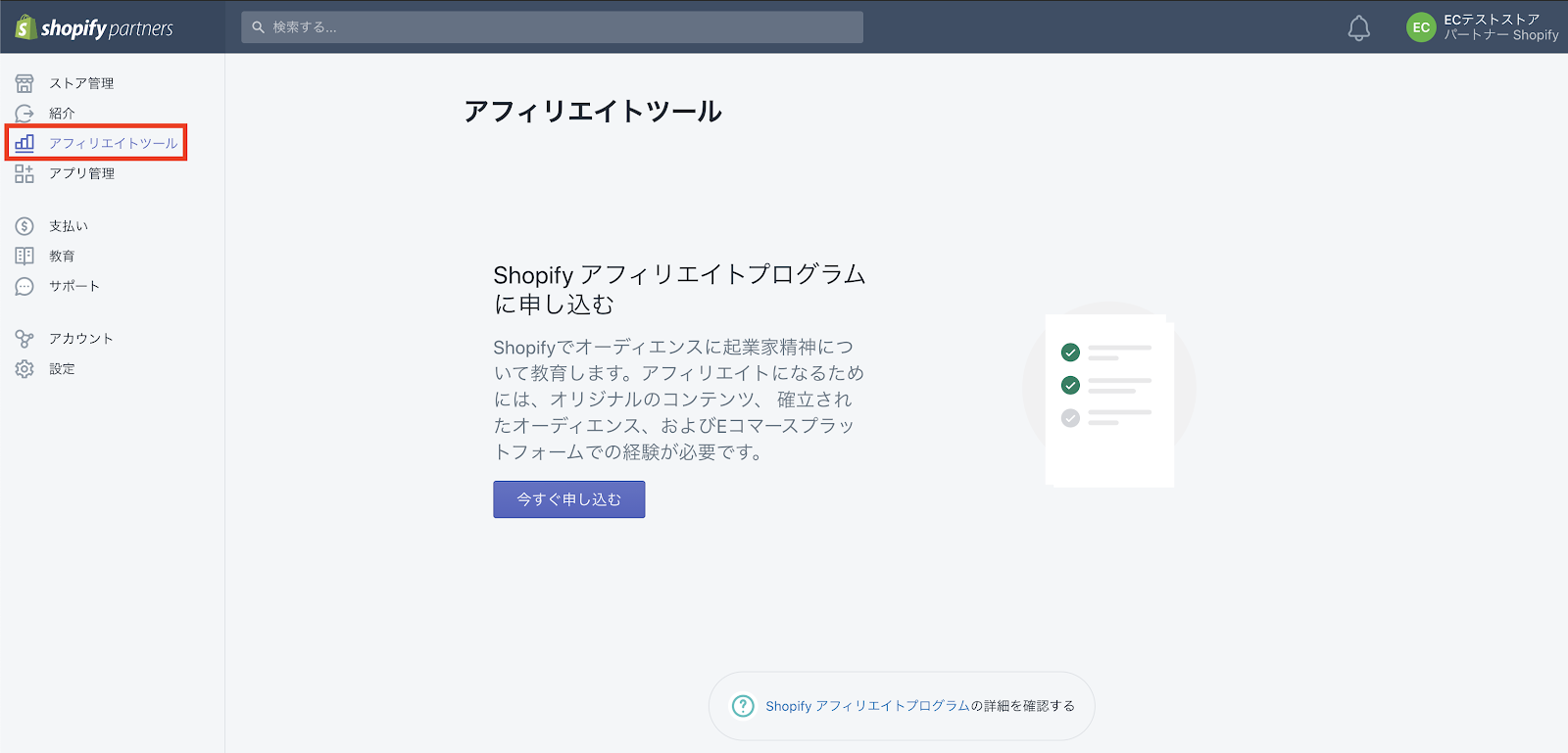 「アフィリエイトツール」の項目では、Shopify アフィリエイトプログラムに申し込むことができます。