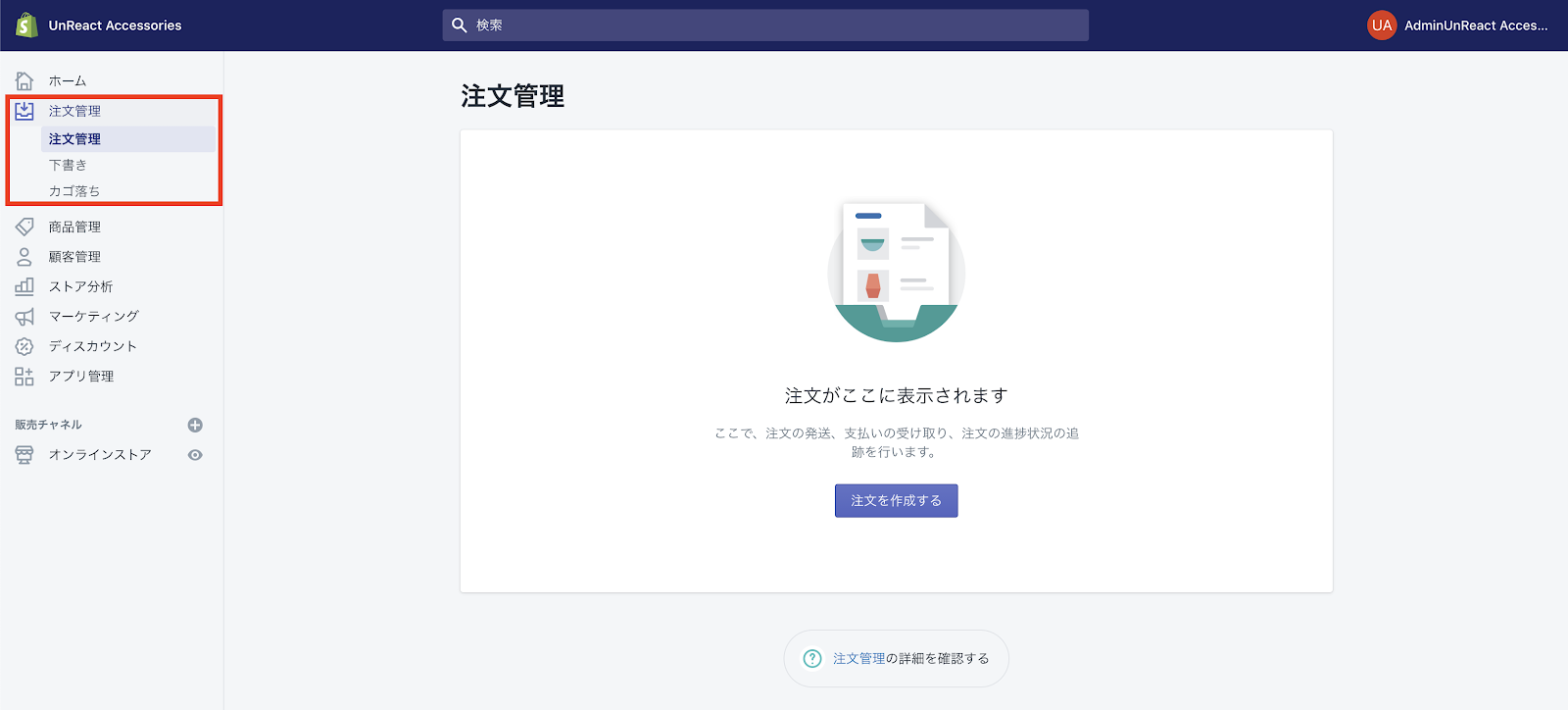 「注文管理」では、オンラインストアで受けた注文について管理することができます。注文の発送や、支払いの受け取り、注文の進捗状況の追跡を行うことができます。