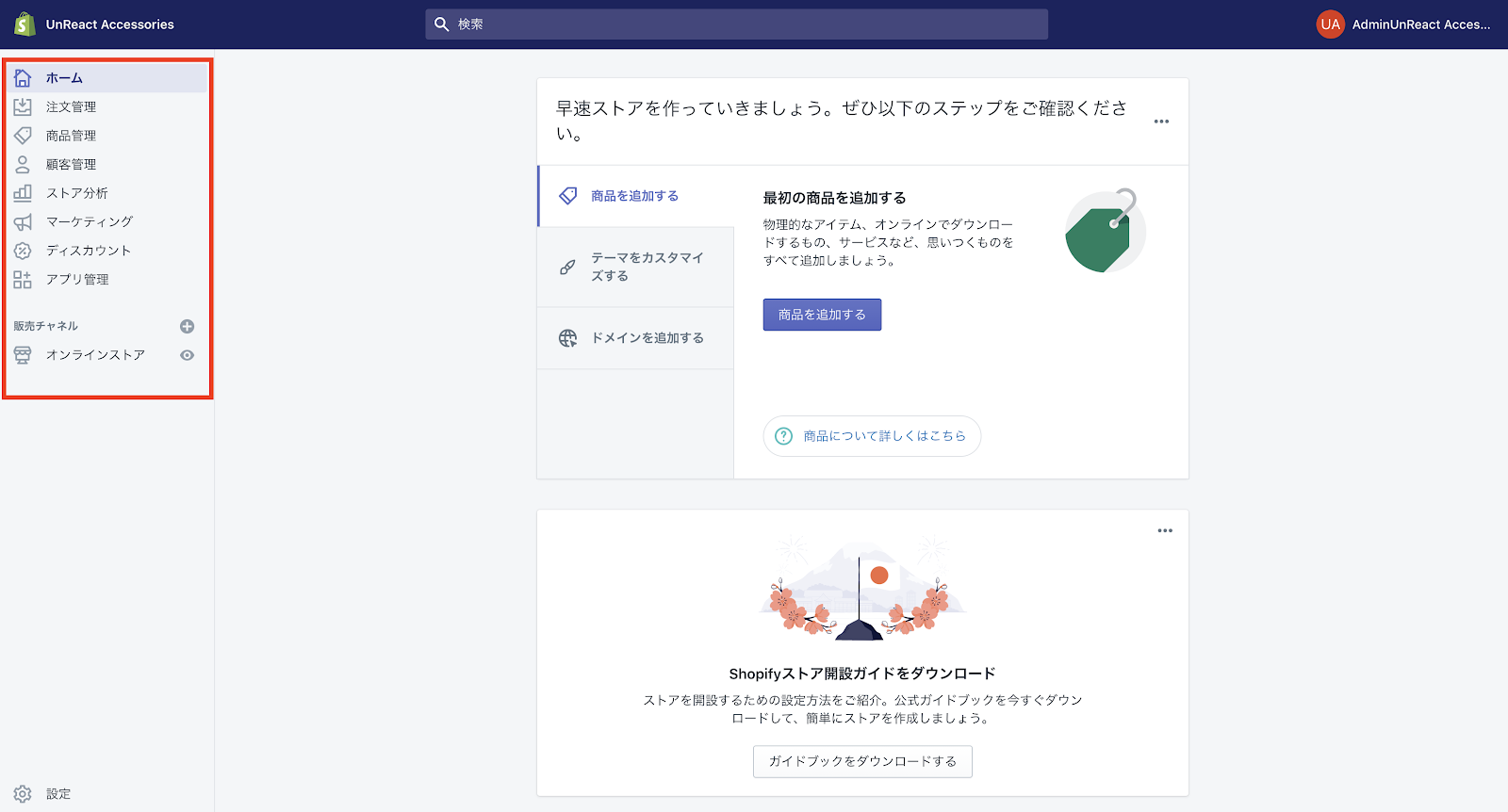 Shopify ストアの管理画面(ダッシュボード)でできることを把握する