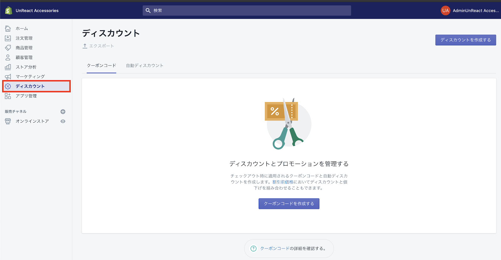 「ディスカウント」の項目では、クーポンコードを発行することができます。ユーザーは発行されたクーポンコードをチェックアウト時に適用することで、安く買い物をすることができます。