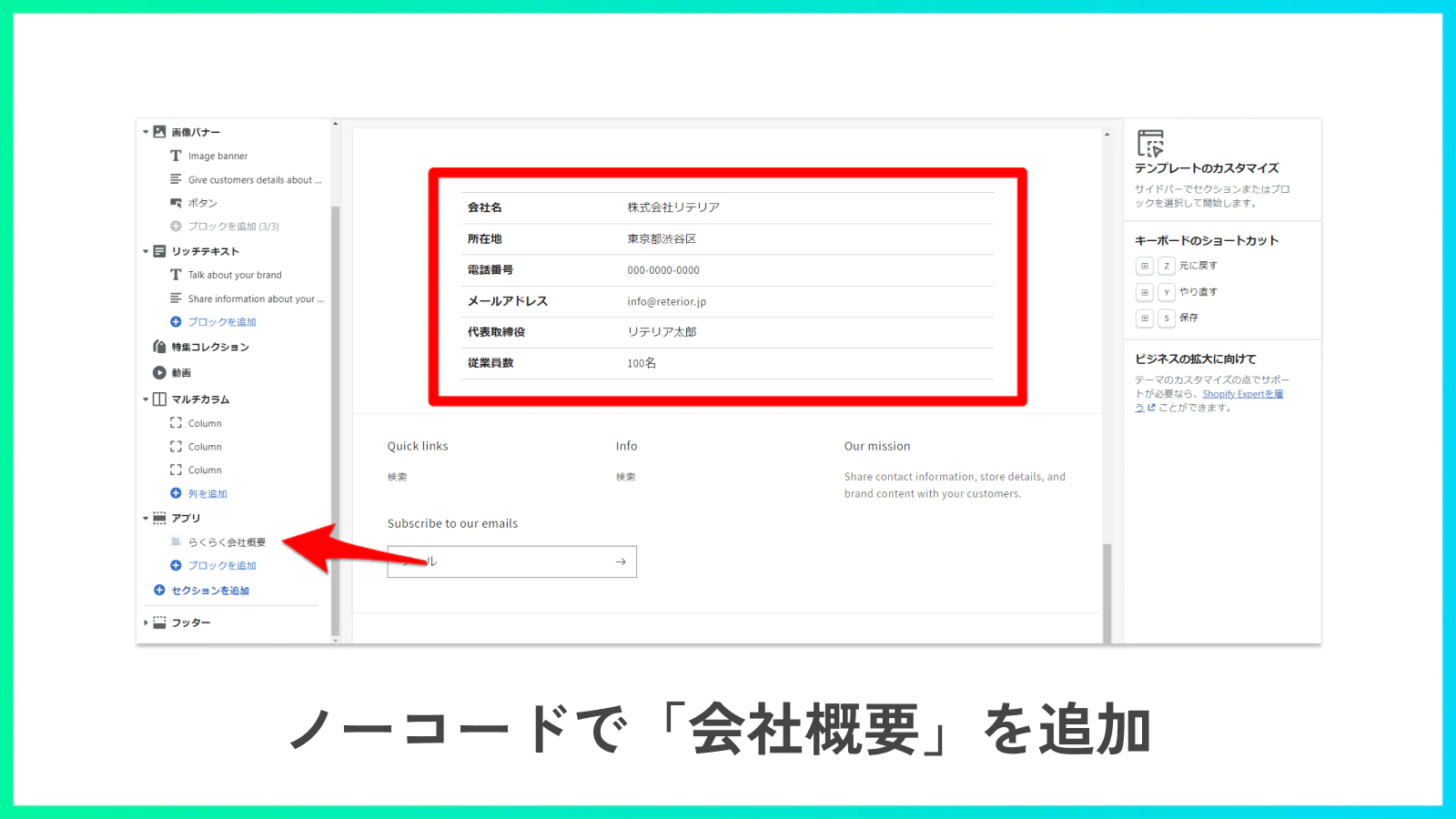 こちらのアプリを使用すると、ノーコードで簡単に About ページに「会社概要」として使用できる表を挿入することができます。