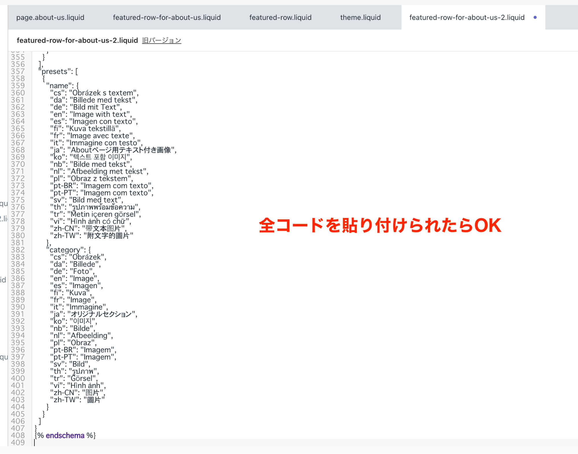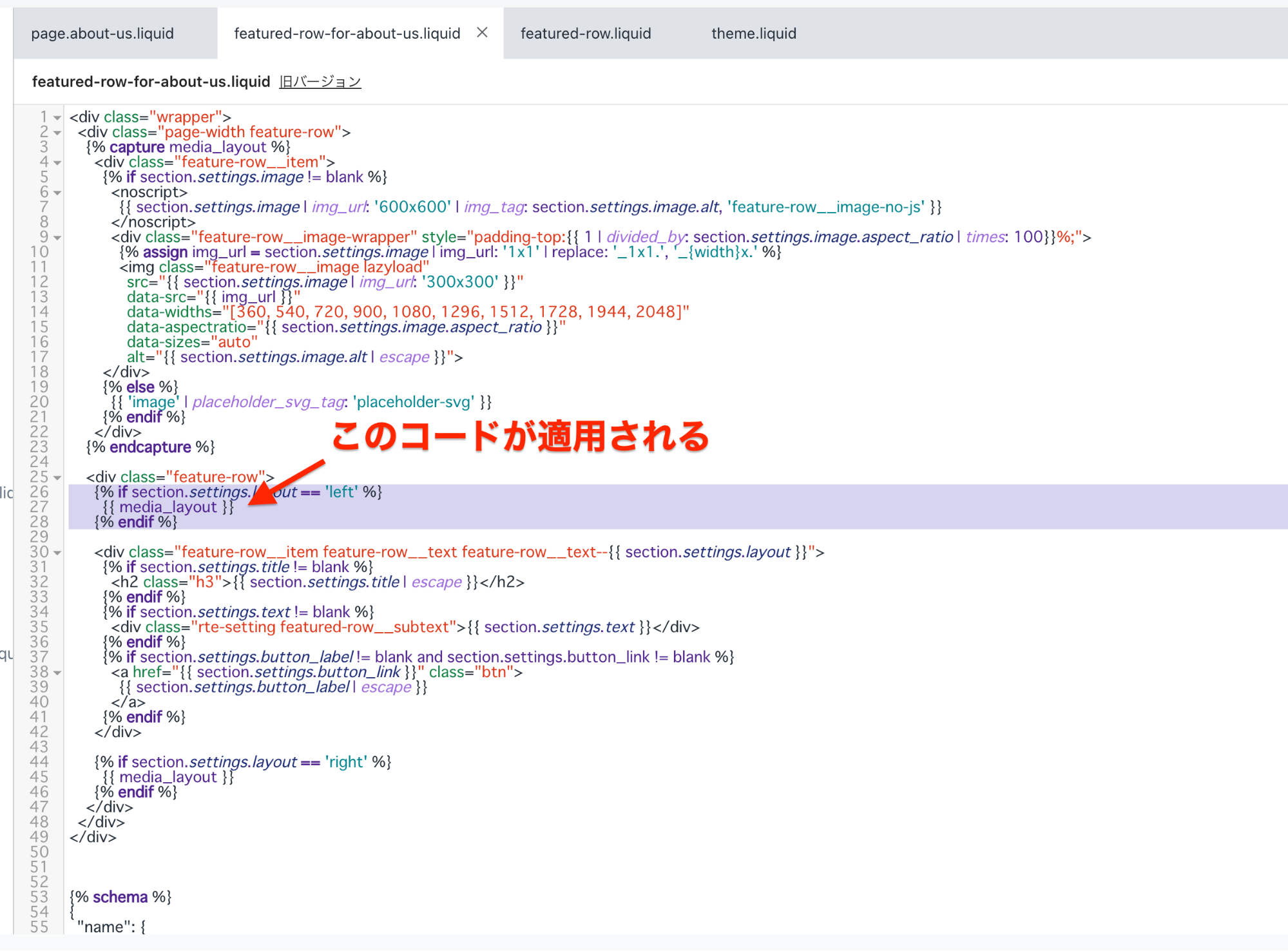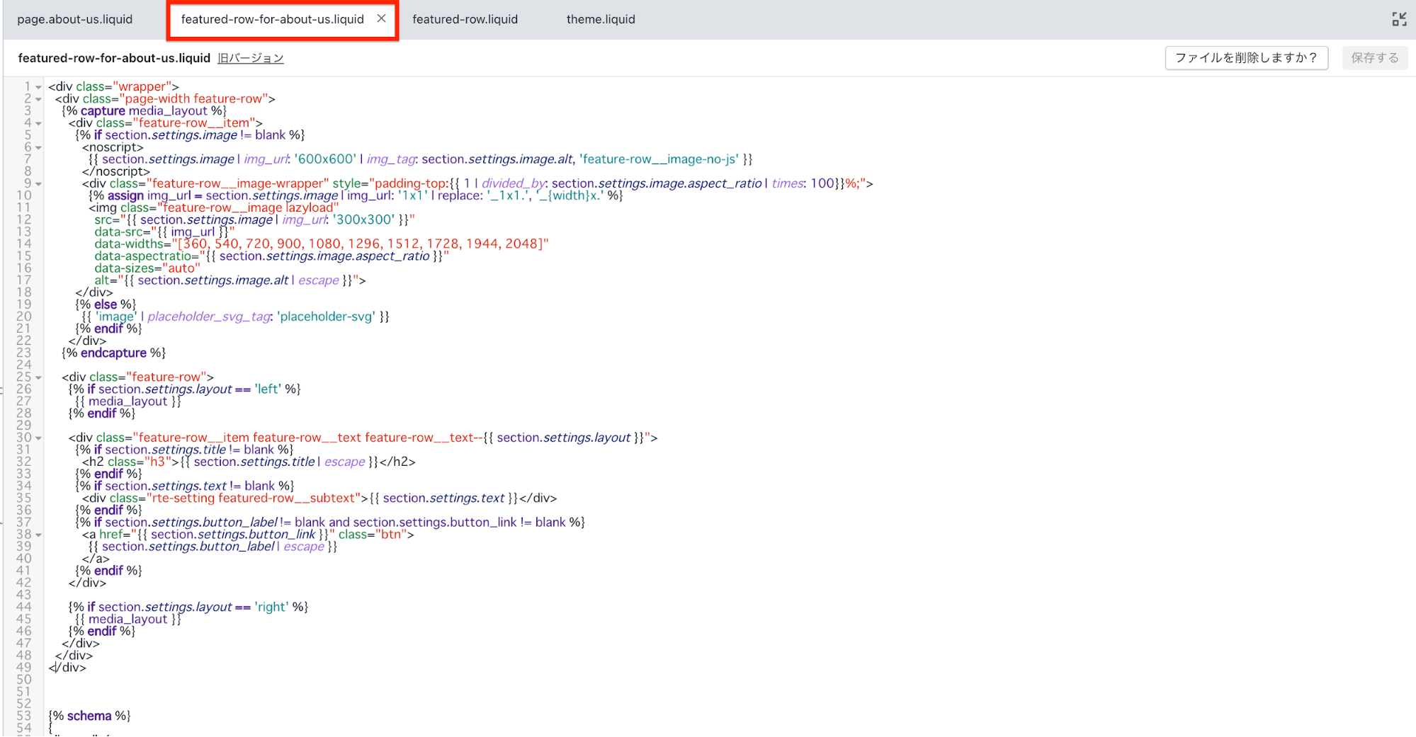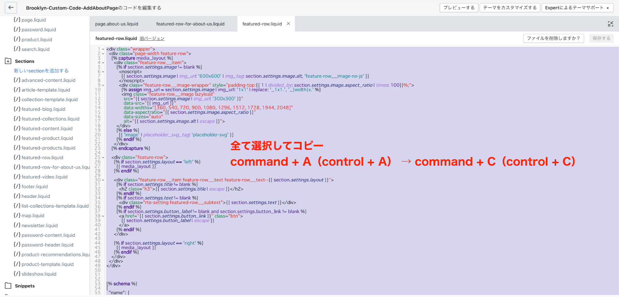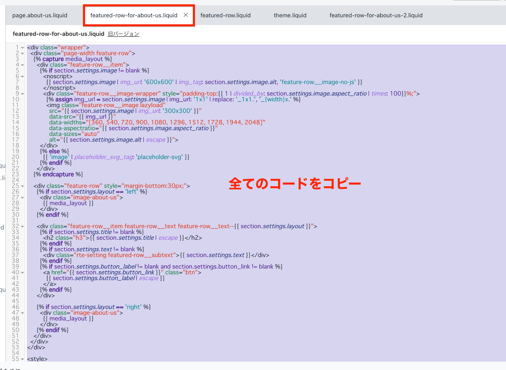 - 「featured-row-for-about-us.liquid」の全てのコードをコピーする