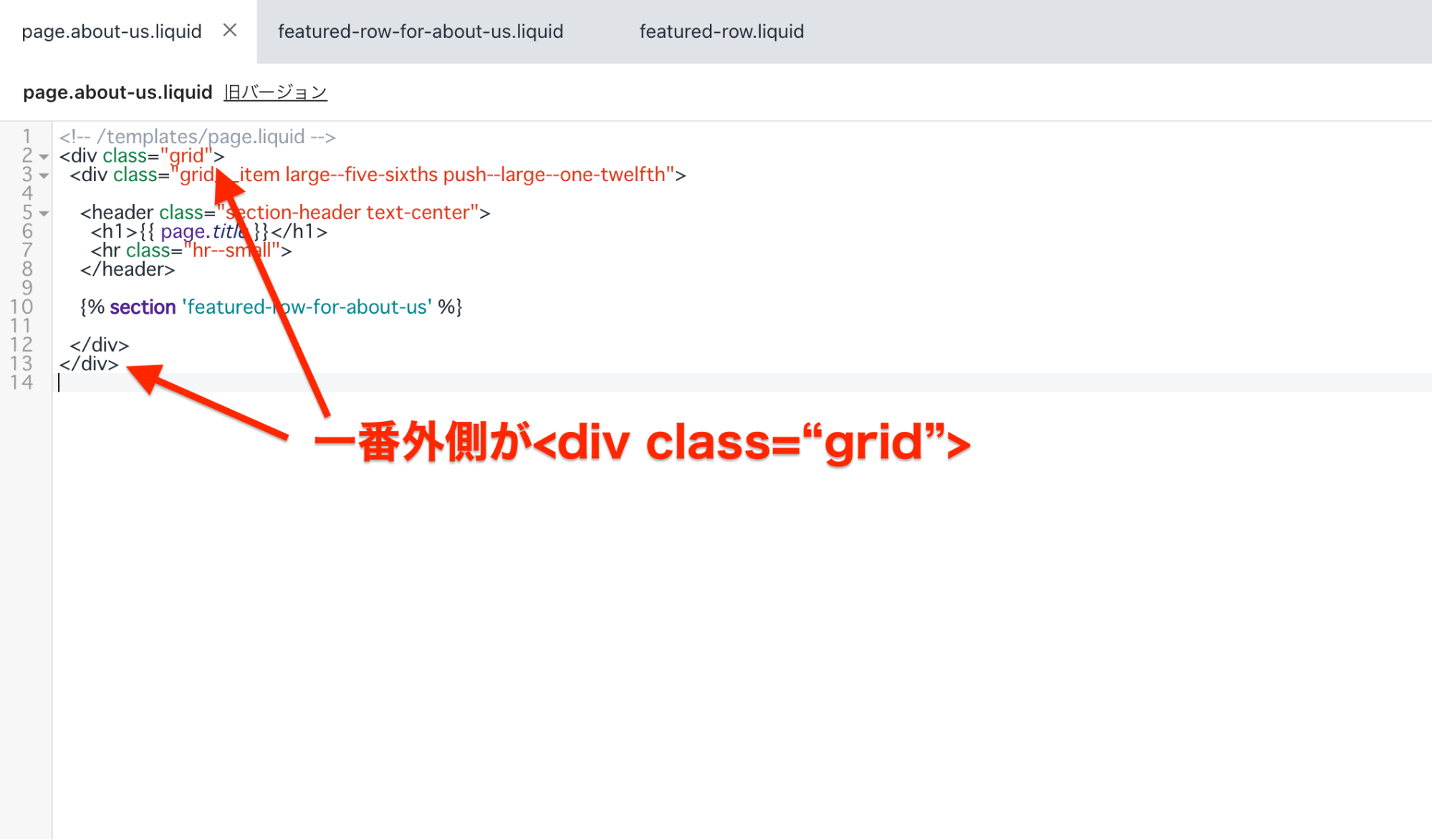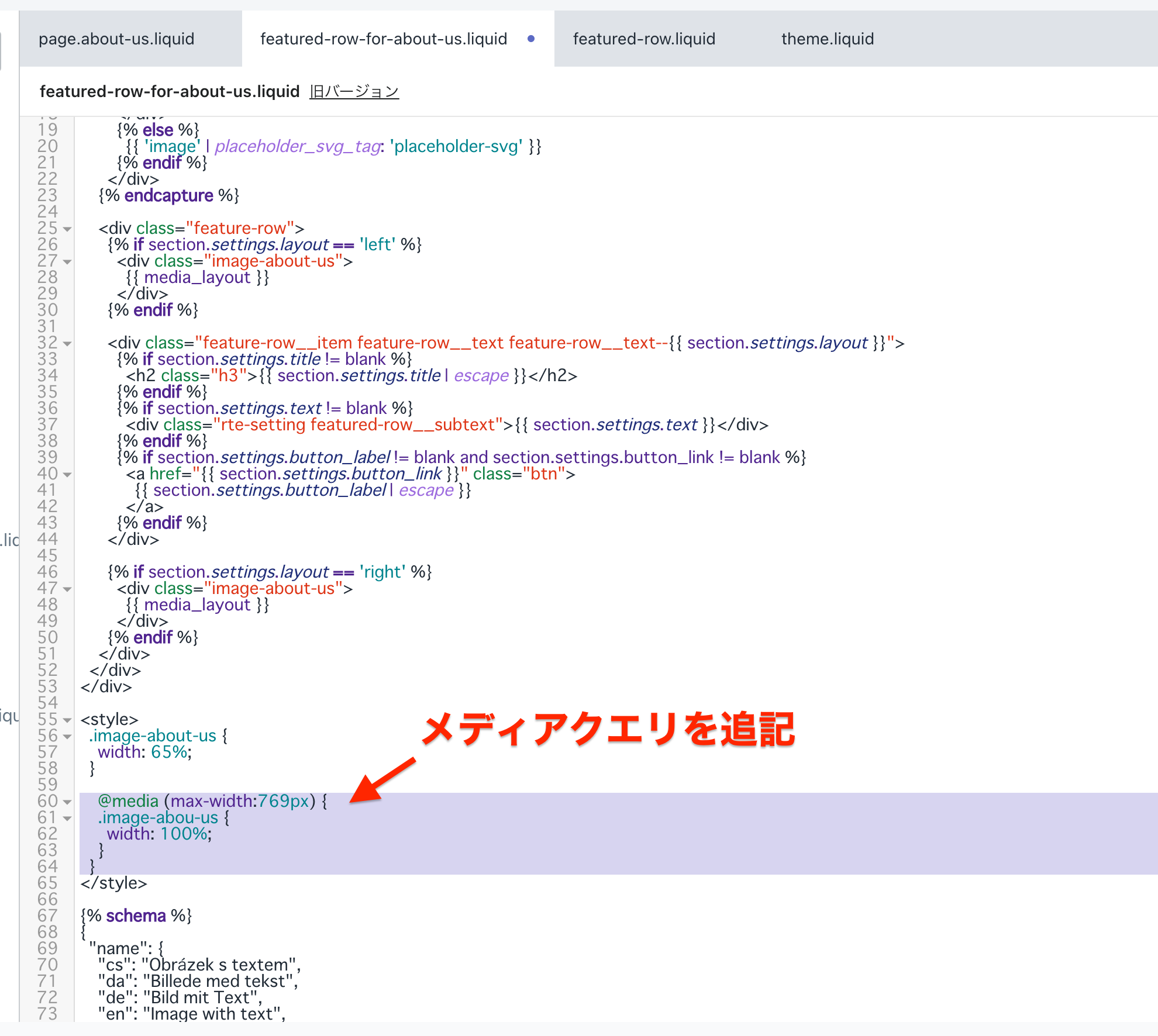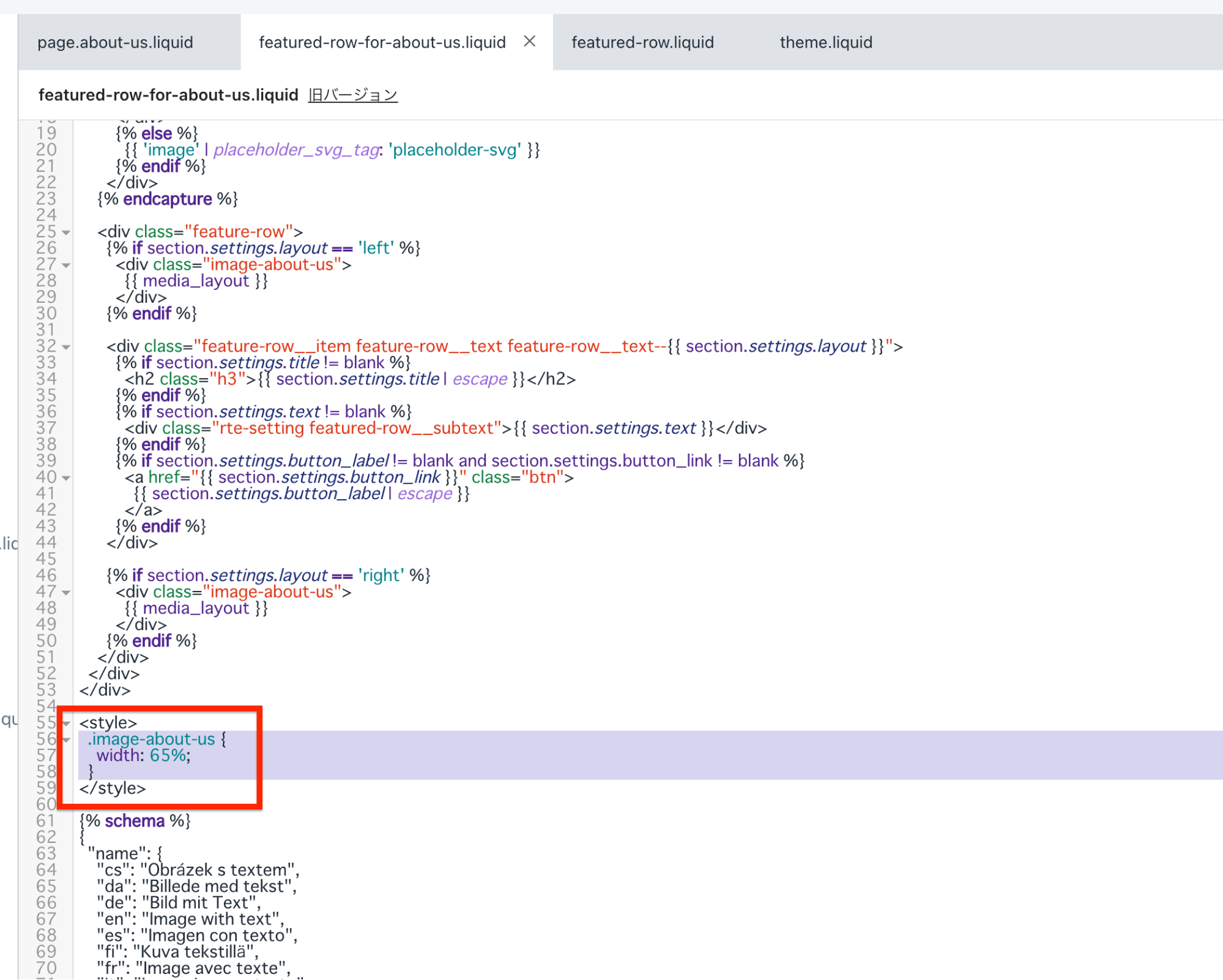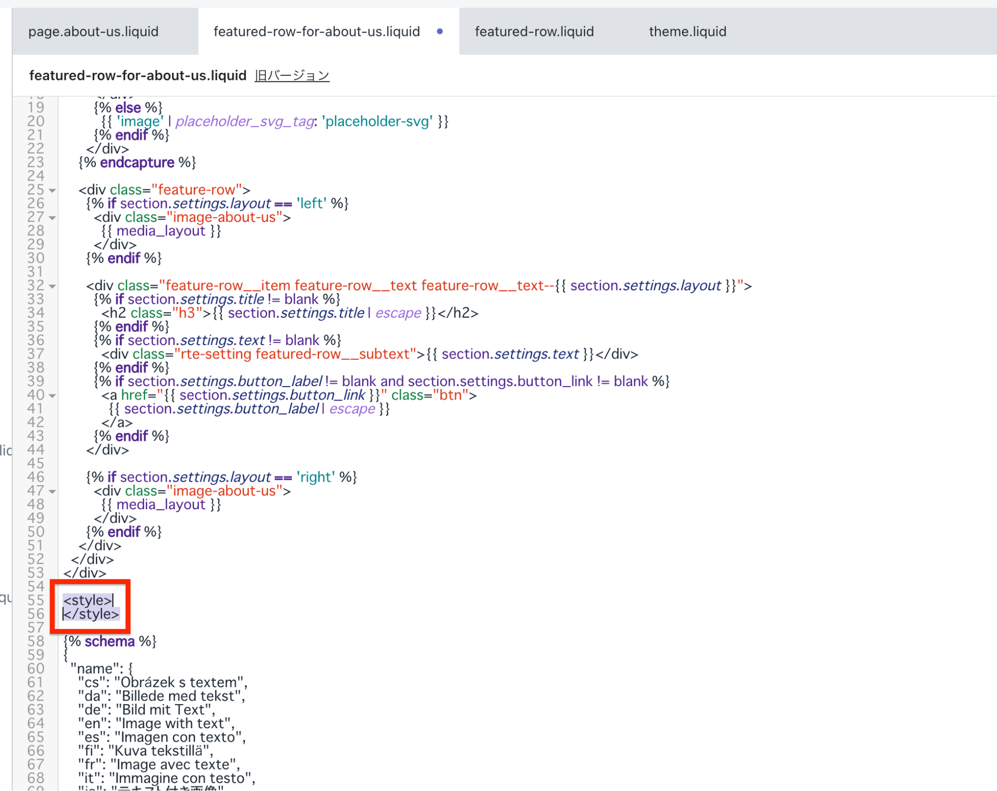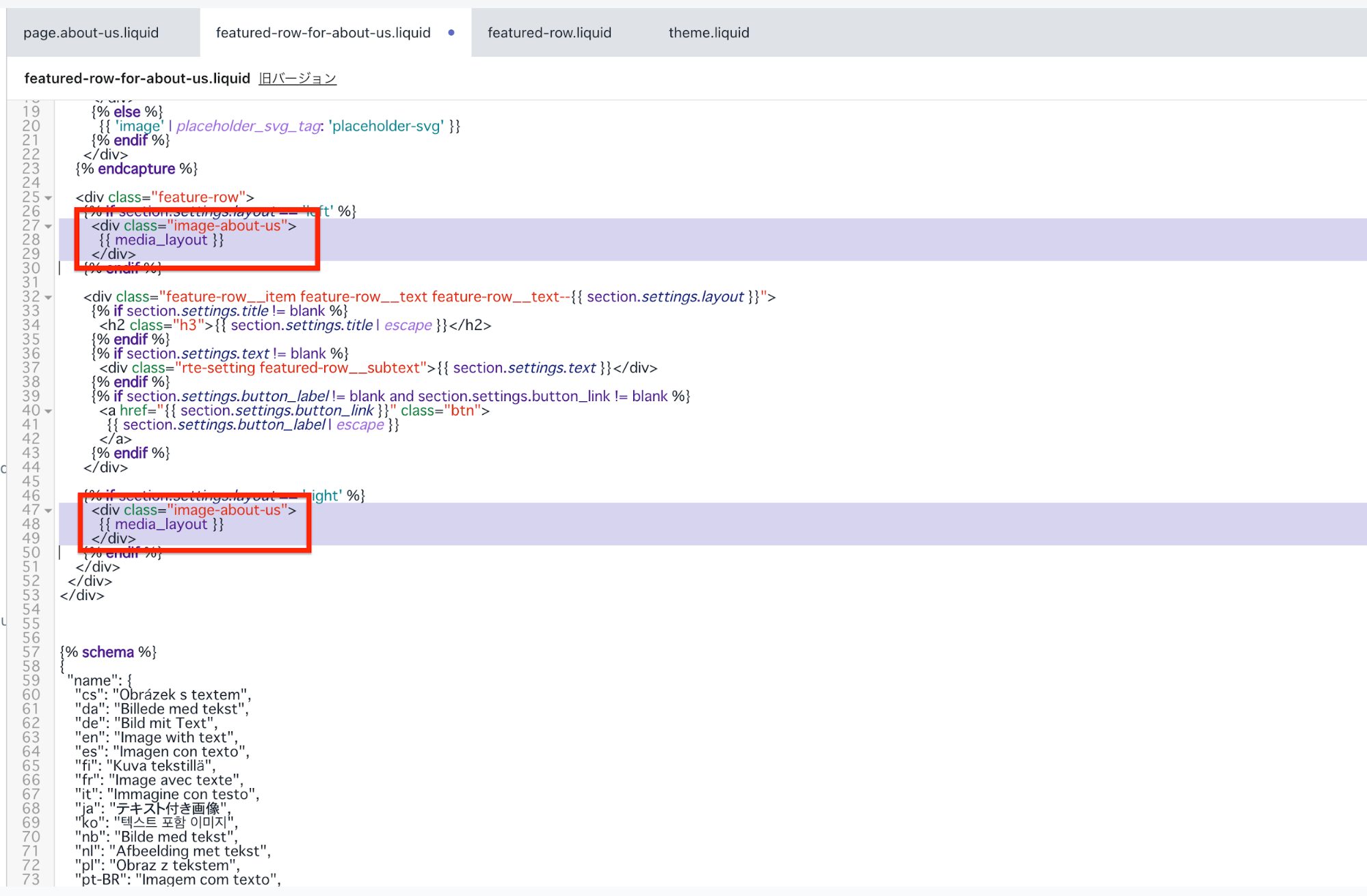 - 「featured-row-for-about-us.liquid」の全てのコードをコピーする