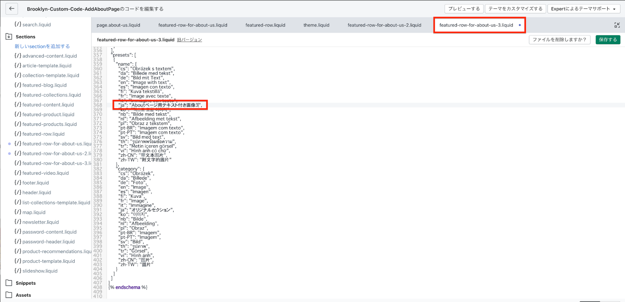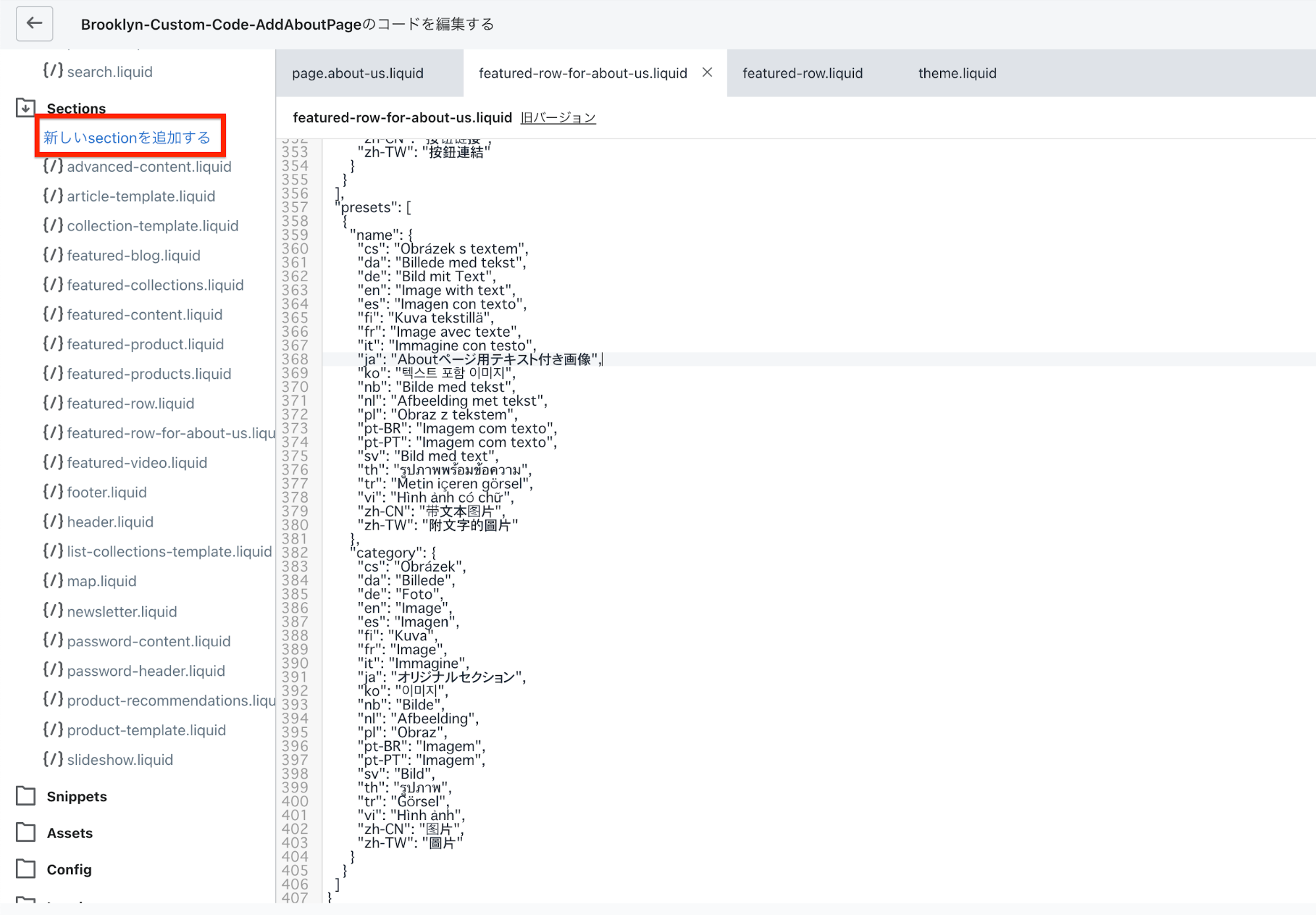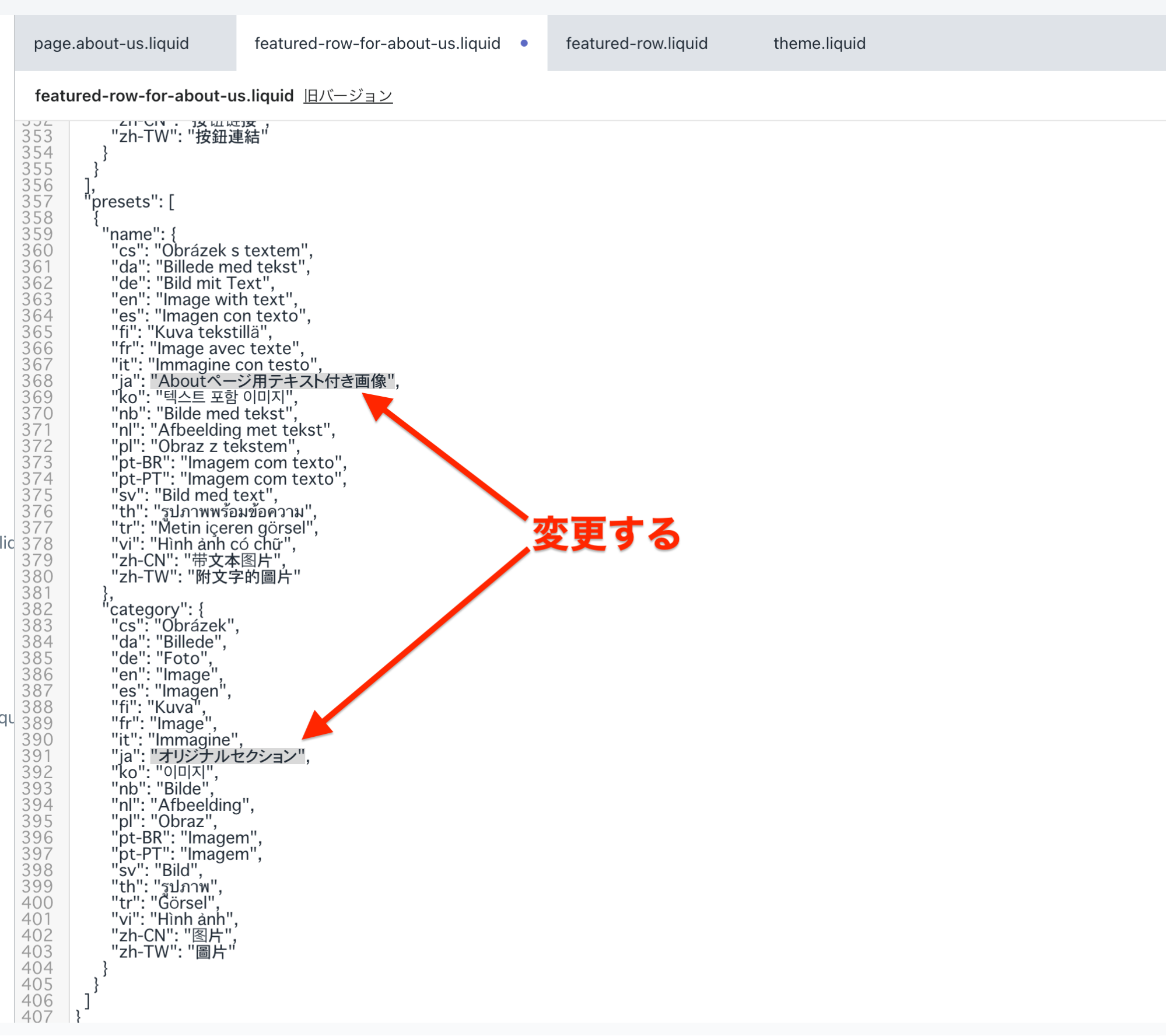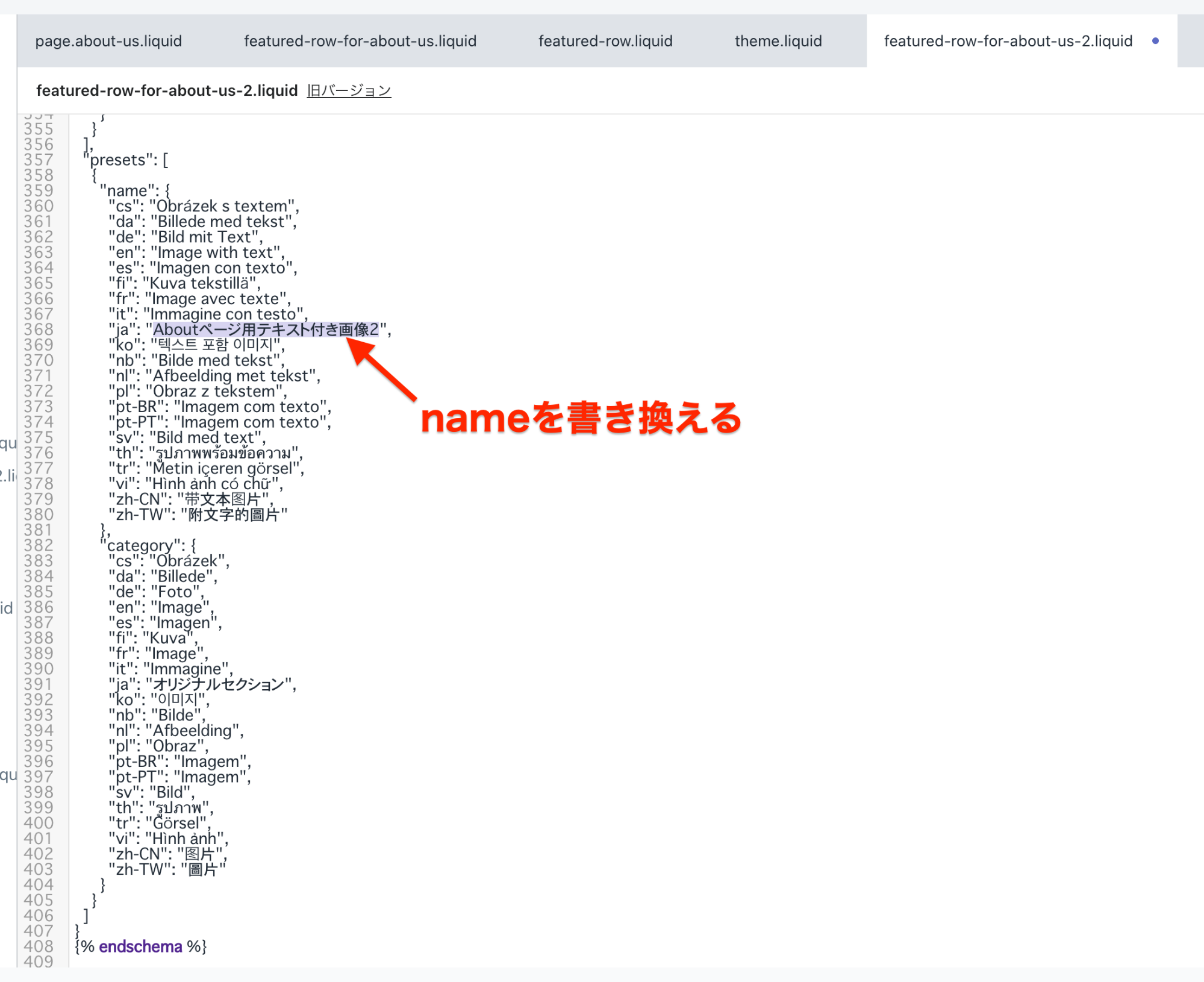 最後に新規作成したセクションに名前をつけます。コード編集画面で「featured-row-for-about-us.liquid」を開きます。ファイルを下までスクロールし、357 行目の「presets」の項目を書き換えます。この「presets」には何が書いてあるのかというと、セクションの名前とセクションのカテゴリー分けが設定してあります。他言語で書いてあるので少しわかりにくいですが、日本語で簡略化して書くと次のようになっています。