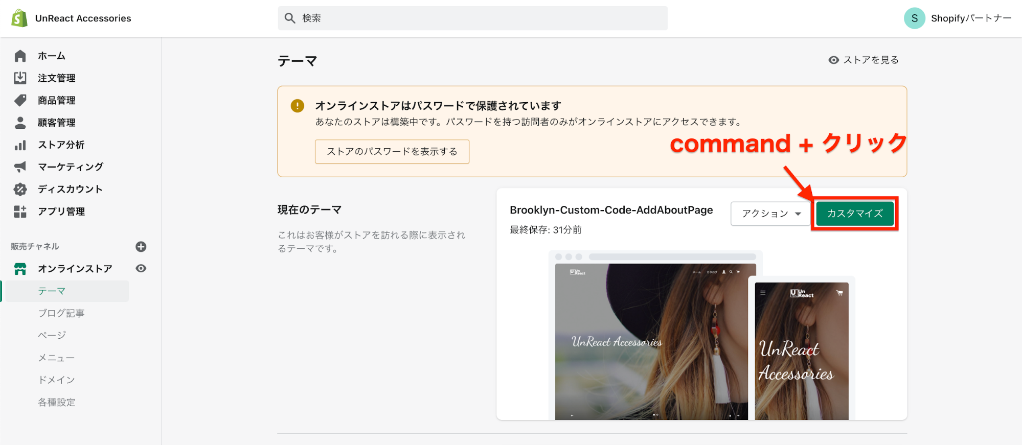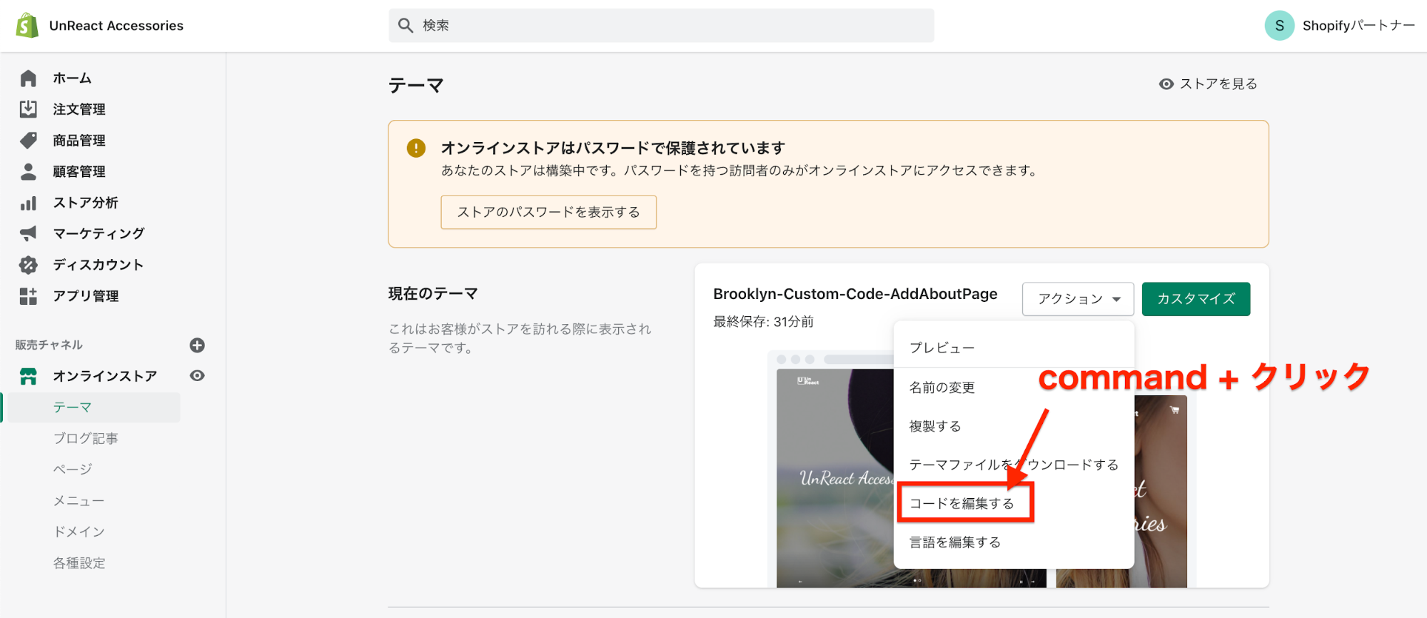 「現在のテーマ > カスタマイズ」と「現在のテーマ > アクション > コードを編集する」を別タブで開きます。別タブで開くには「command + クリック(Windows の場合は control + クリック)」します。