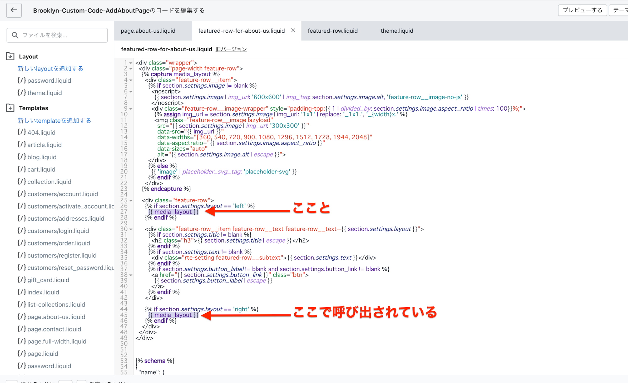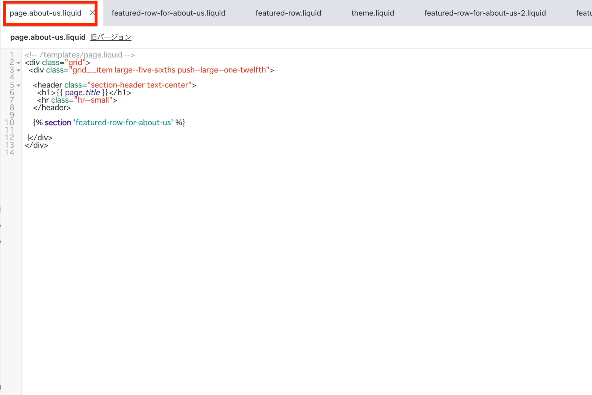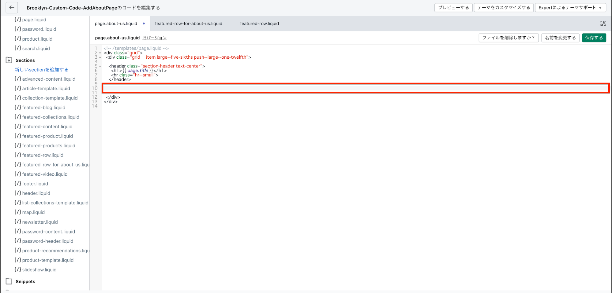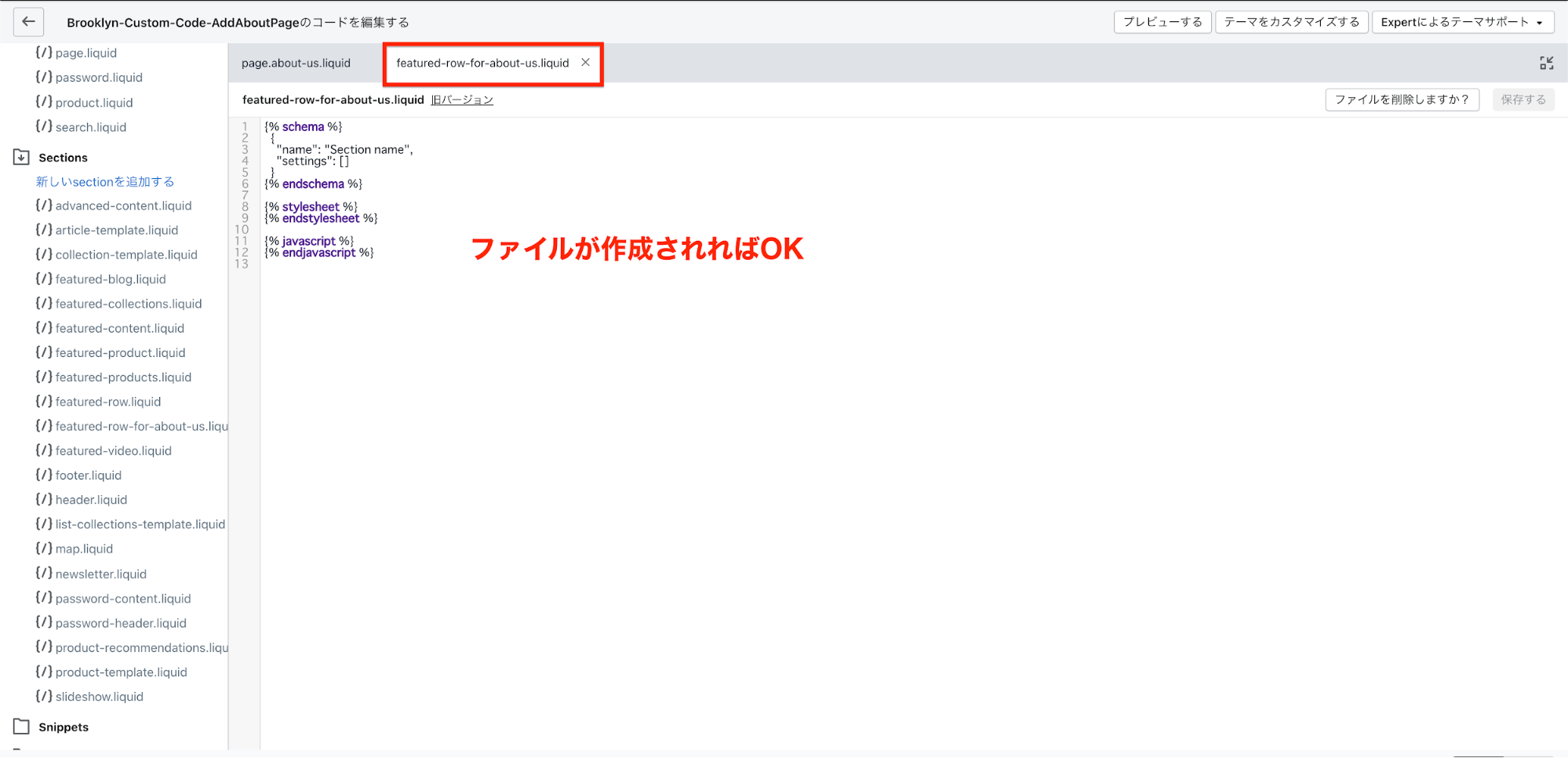 このように「featured-row-for-about-us.liquid」ファイルが作成されれば OK です。