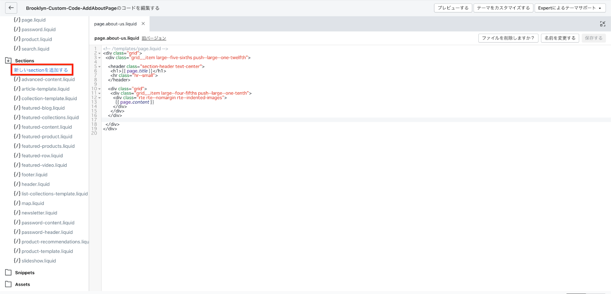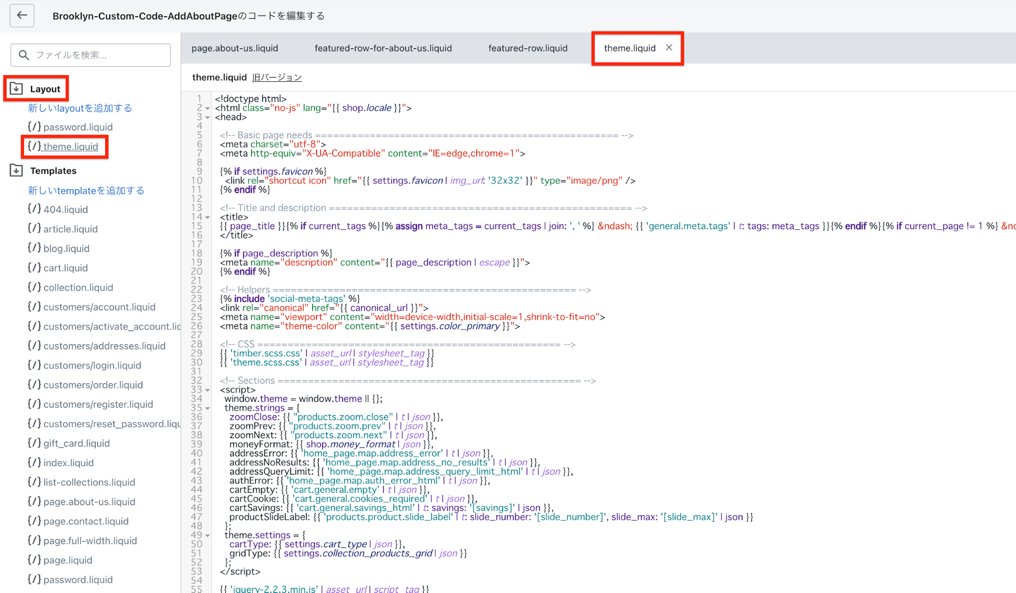 コードの編集画面で「page.about-us.liquid」ファイルを開いてください。