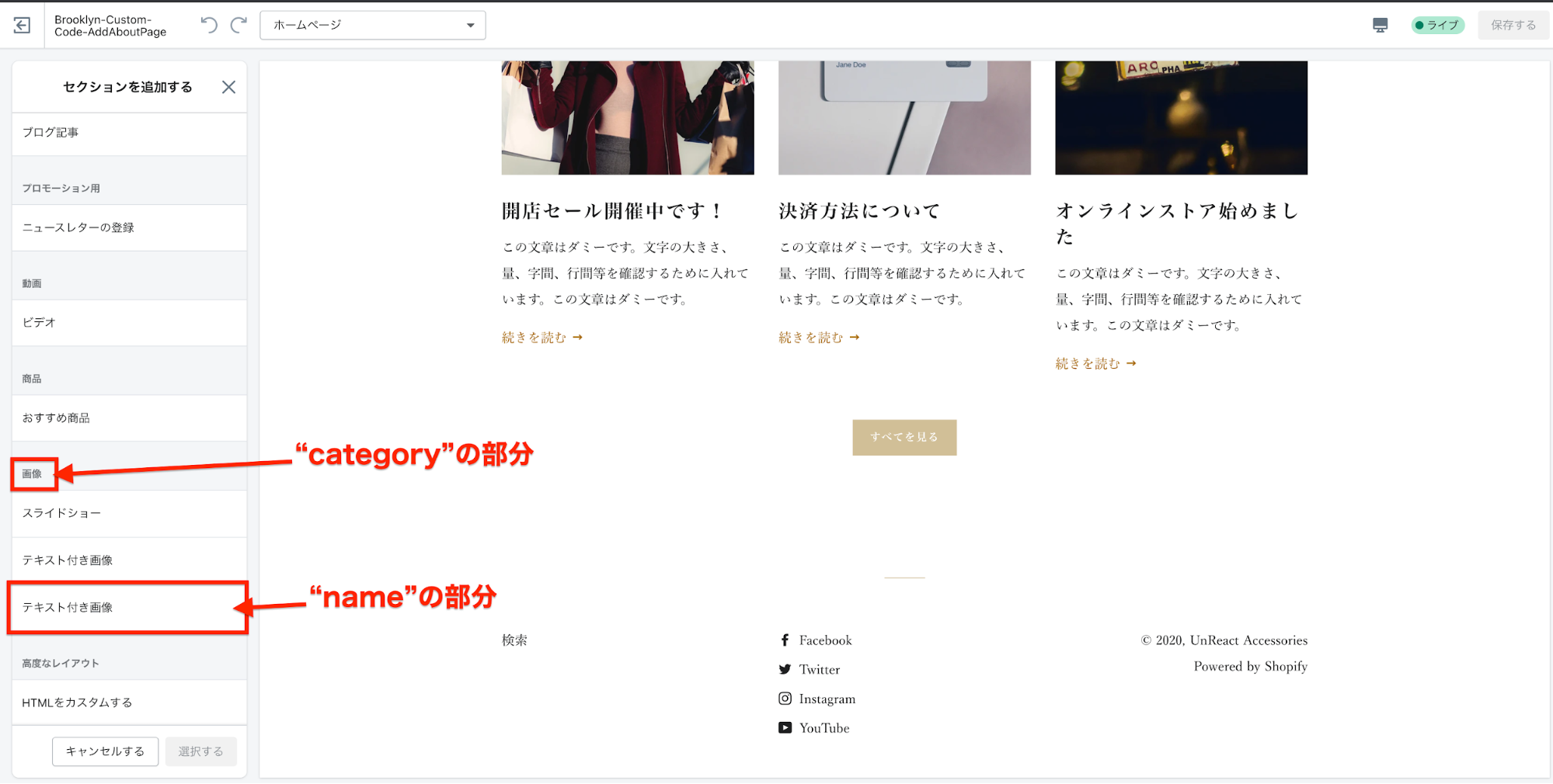 今はテキスト付き画像のセクションをコピーしているだけなので、カテゴリー分けも名前も同じセクションが二つ存在してしまっています。中身は違うのに同じ名前のセクションが二つあったら混乱してしまうので、新規で作成したセクションの名前とカテゴリー分けを編集します。