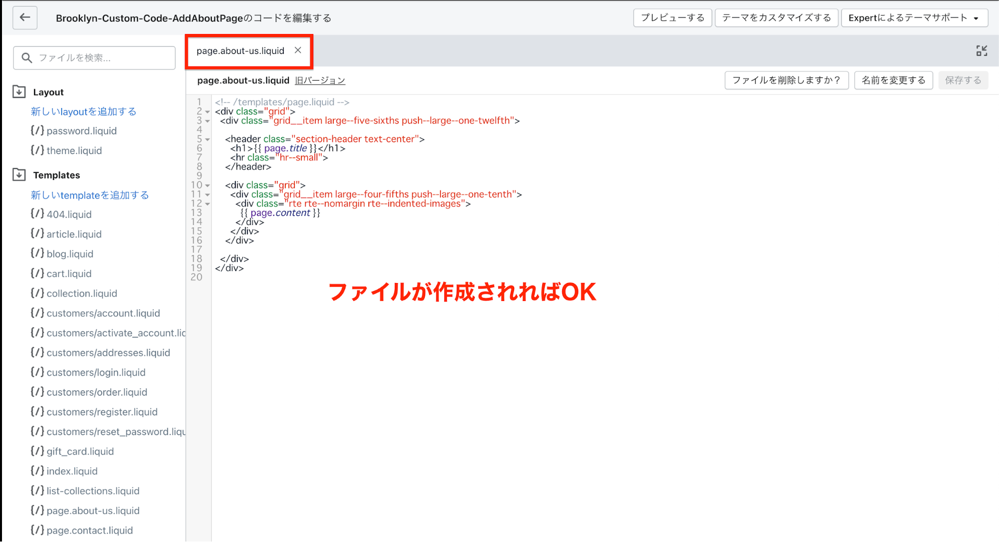「page.about-us.liquid」というファイルが作成されれば OK です。ファイル名は「[目的].[名前].liquid」という命名規則に準じて自動的につけられます。名前の変更はできないので気をつけましょう。