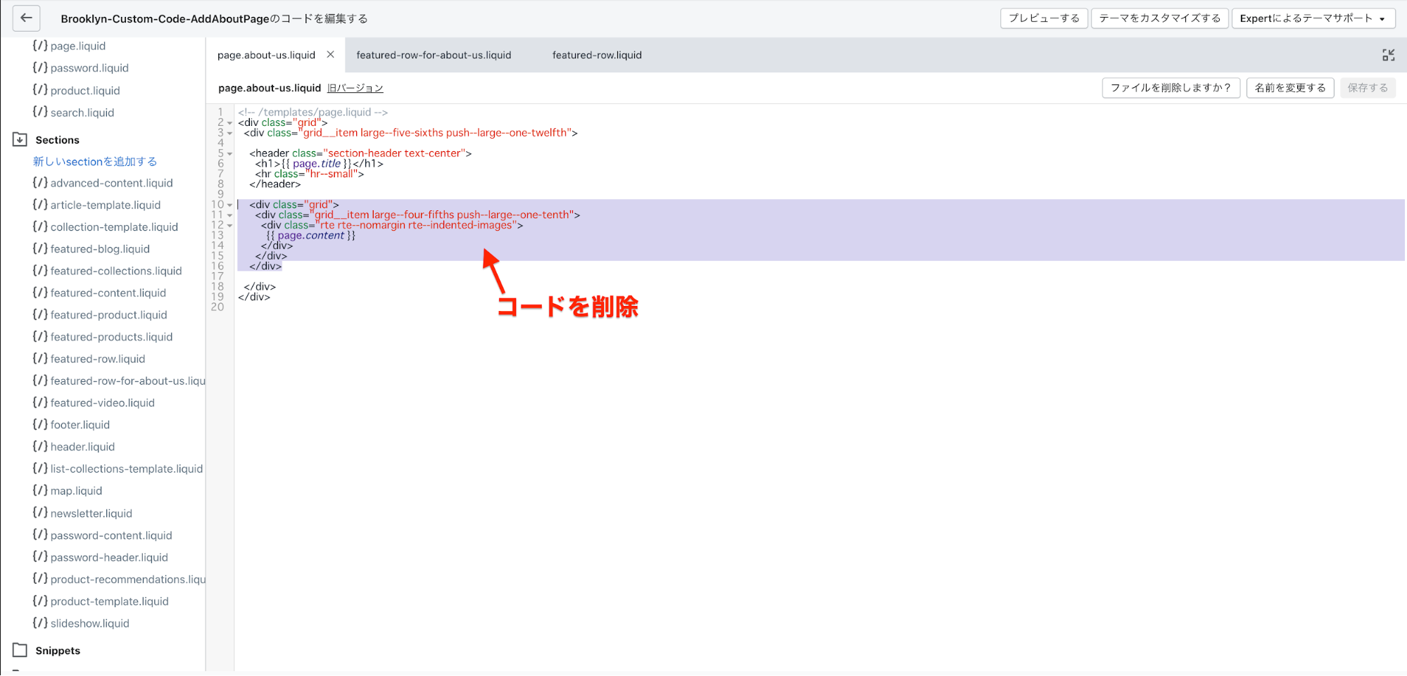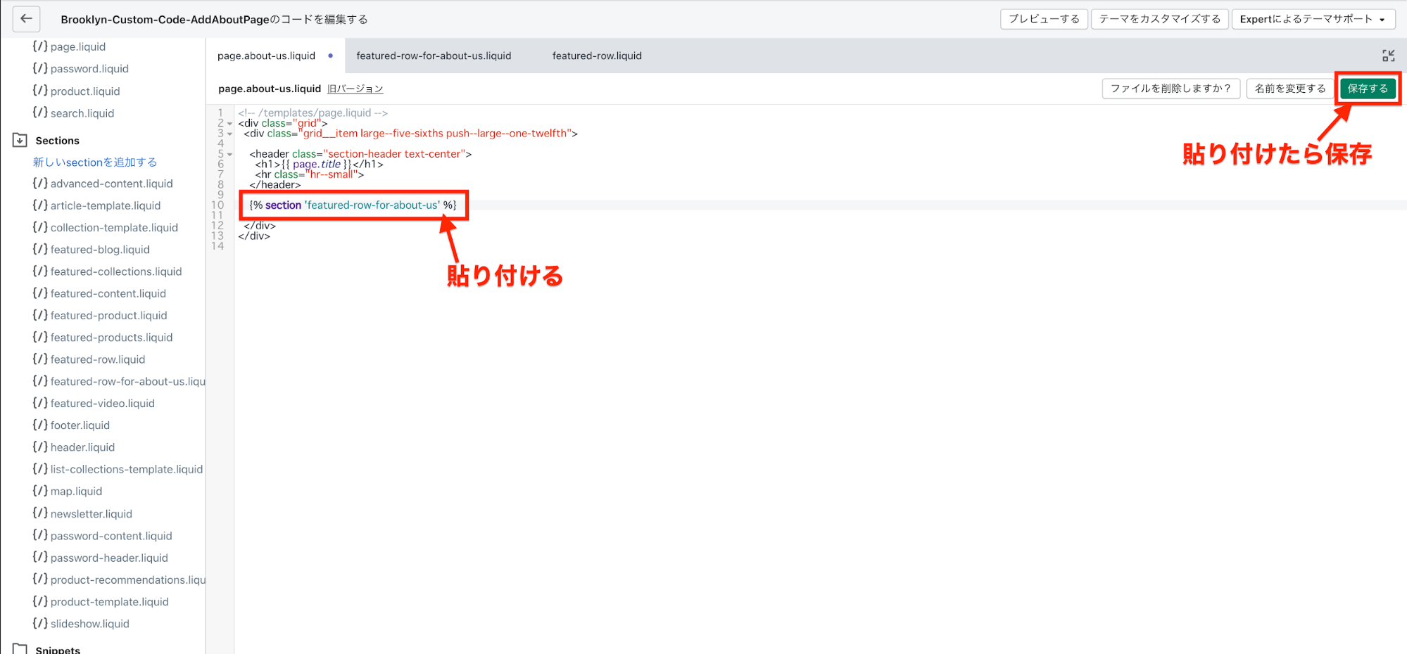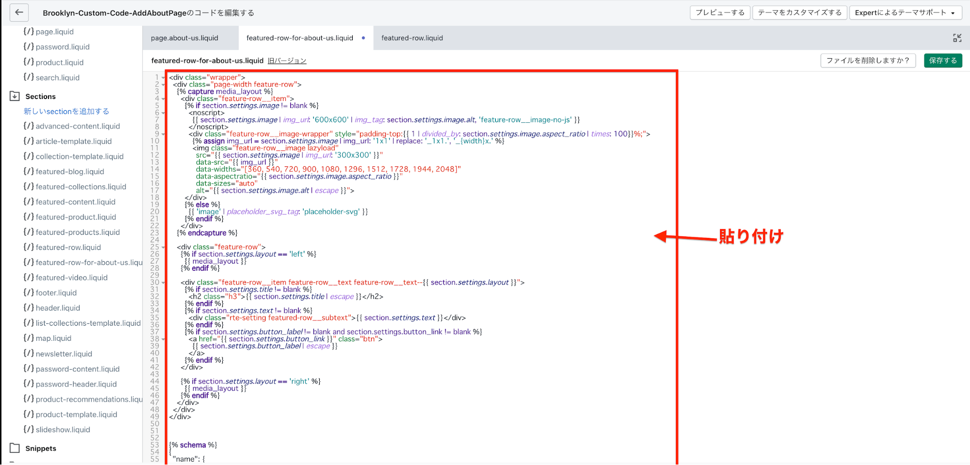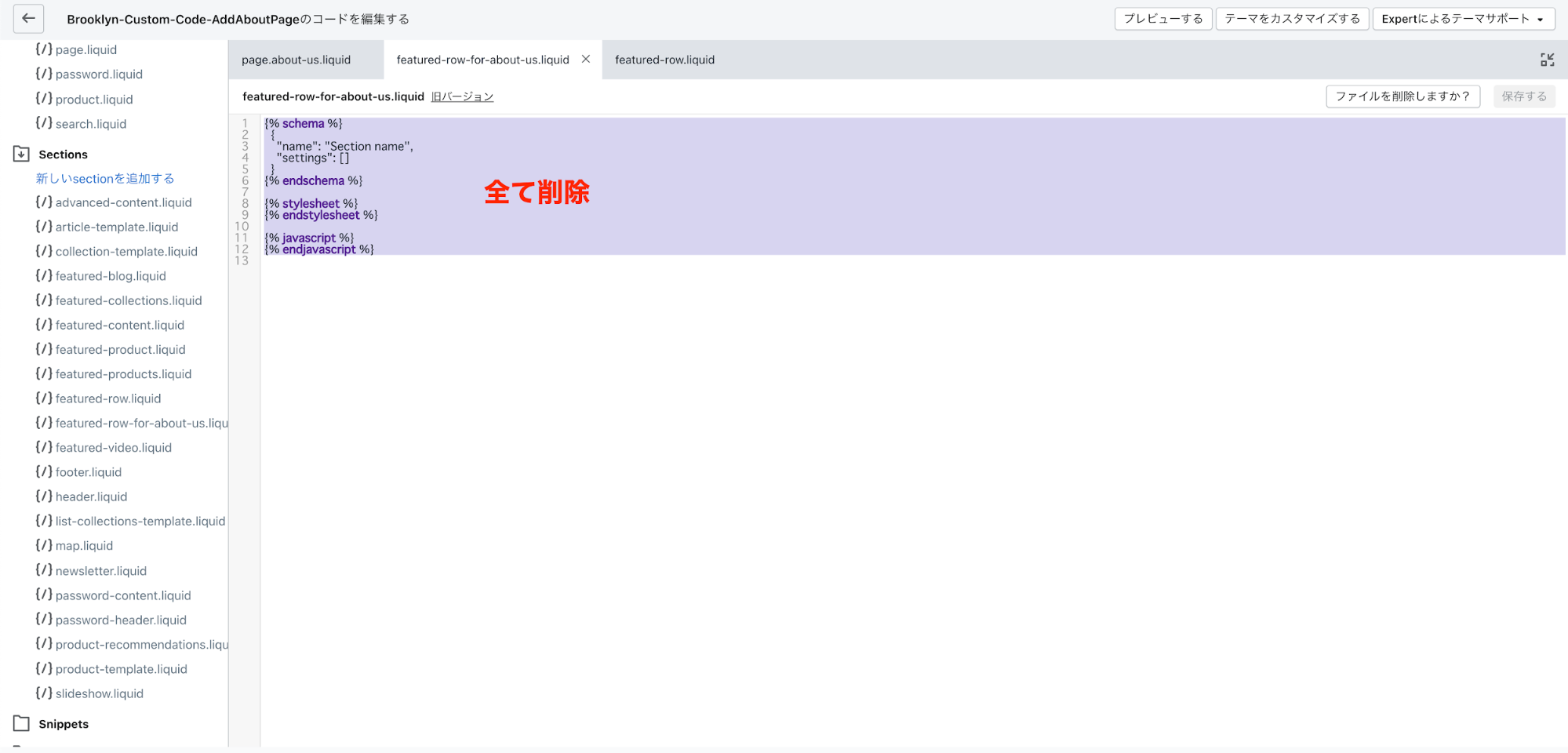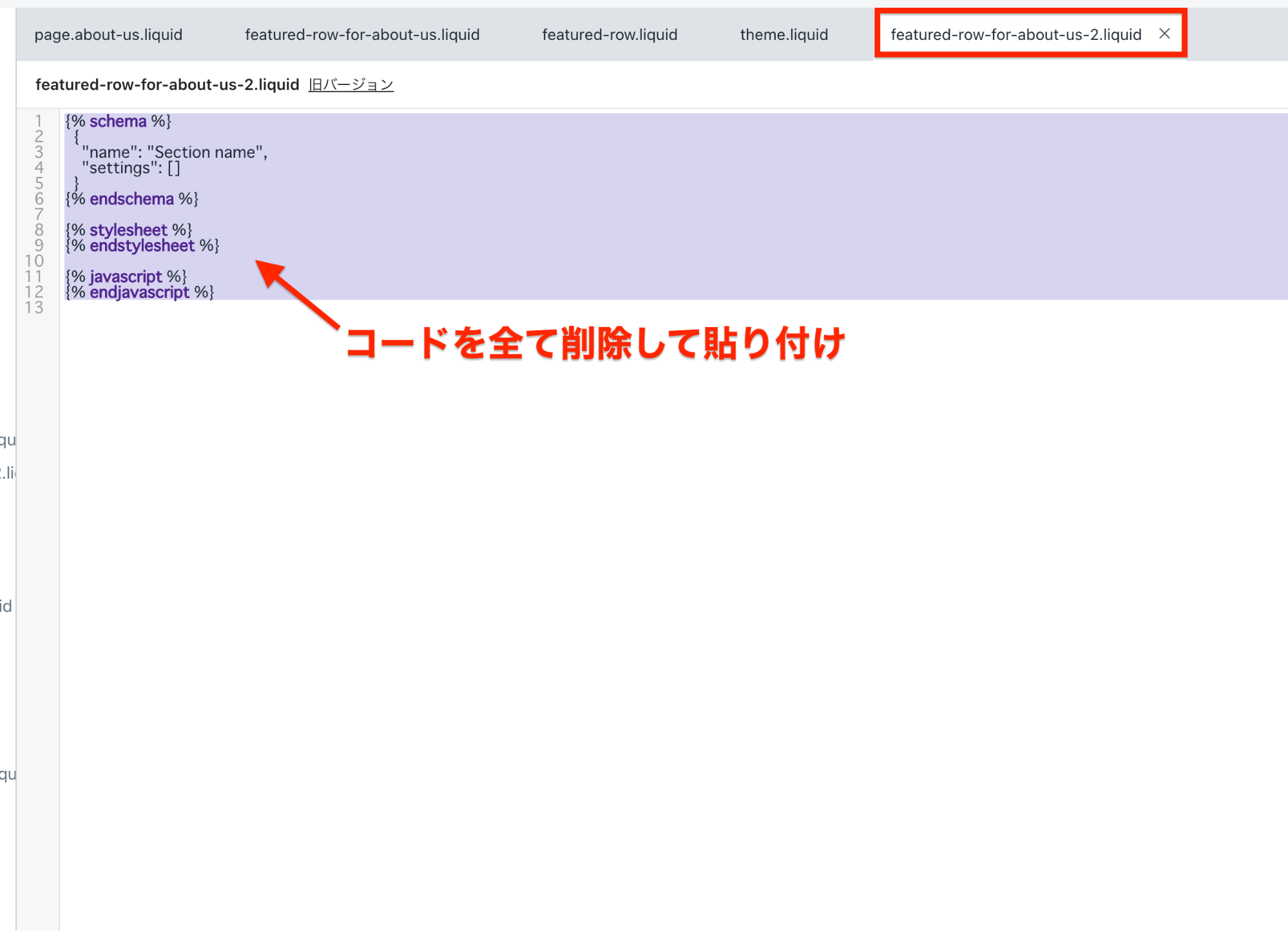コピーしたら「featured-row-for-about-us.liquid」ファイルのコードを全て削除し、貼り付けます。